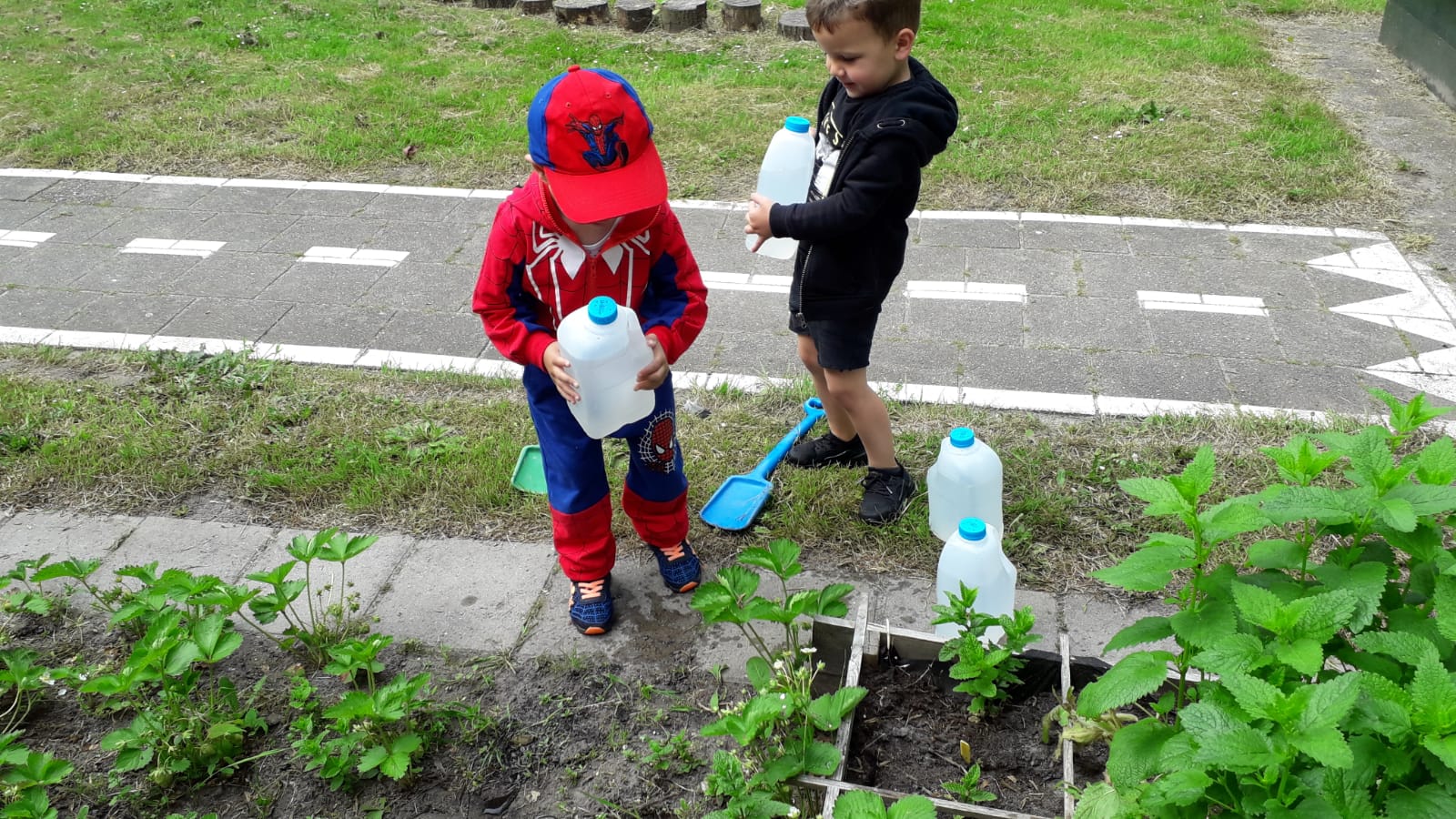 Ook worden er gieters gemaakt om de planten in de moestuin water te geven. En de eerste aardbeien zijn door de kinderen ontdekt!