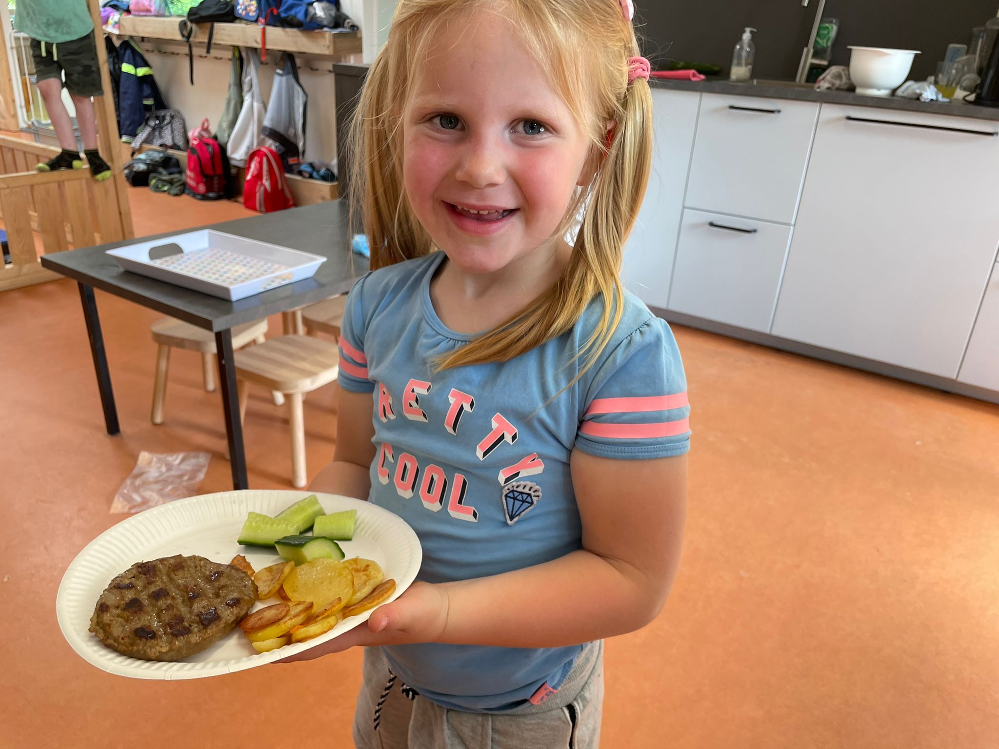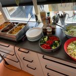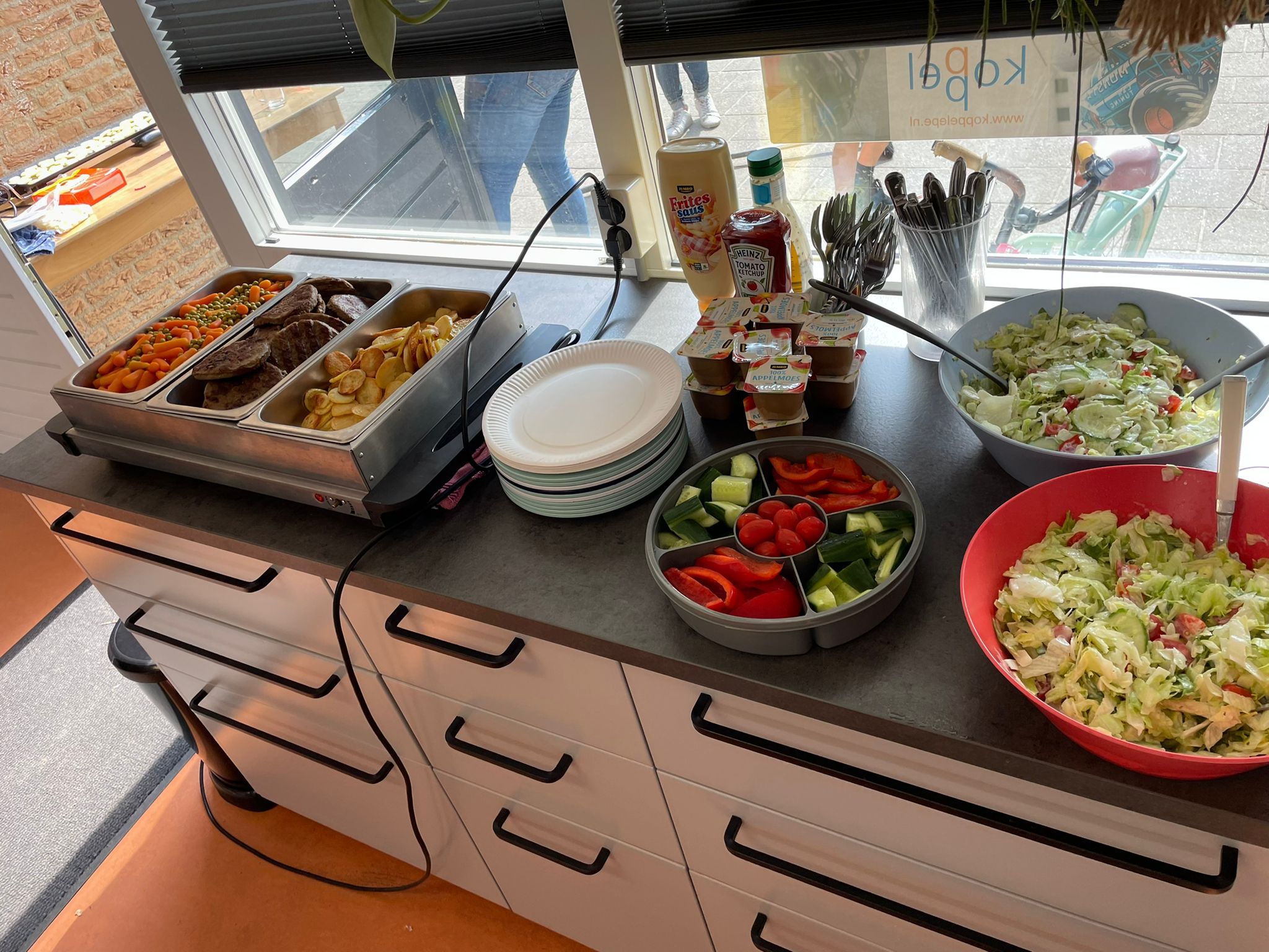 Wij hebben op dinsdag, donderdag en vrijdag met iedereen die wilde samen gegeten, dit omdat dat gezellig is en zodat iedereen met een volle buik de avondvierdaagse kon lopen. Op dinsdag aten wij gebakken aardappels, hamburgers en doppertjes en worteltjes. Op donderdag stonden er diverse wraps op het menu en op vrijdag was er zelfgemaakte pizza.