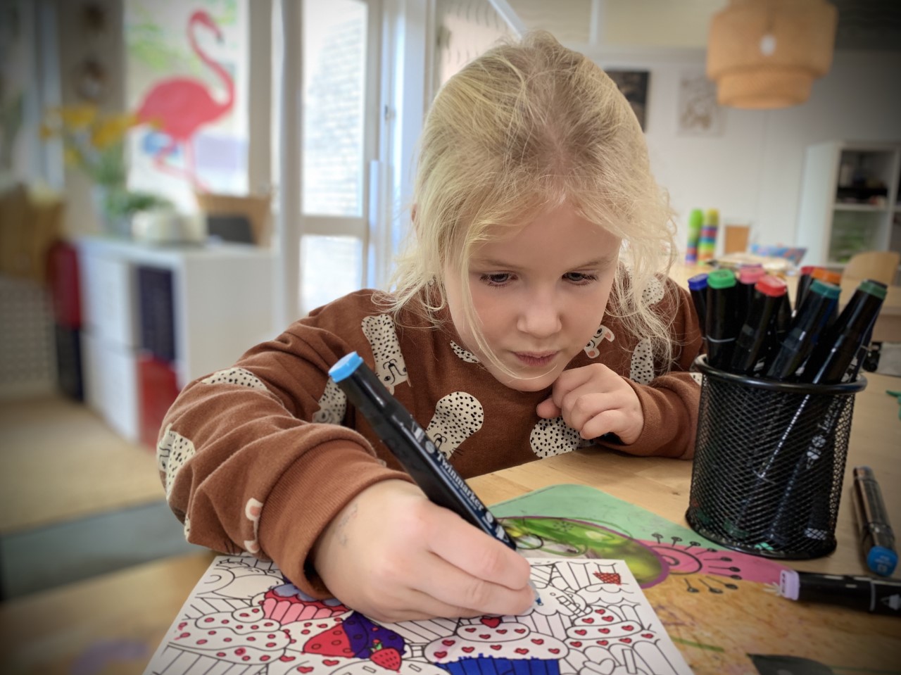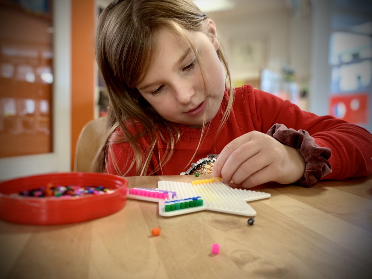 Ook aan knutselmateriaal ontbreekt het hier niet. Zo heeft Eva een poppetje gekleid, Yamilla maakt iets met strijkkralen en kleurt Meike een kleurplaat in.