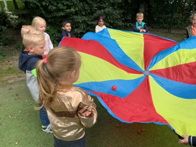 We kunnen de parachute ook hoog boven ons hoofd houden dan kunnen we er zo onder door kijken…..of juist heel laag. Maar het mooiste is als we er een bal in gooien. Samen hard schudden en ja hoor de bal vliegt zo door de lucht uit de parachute…….wat een pret!!