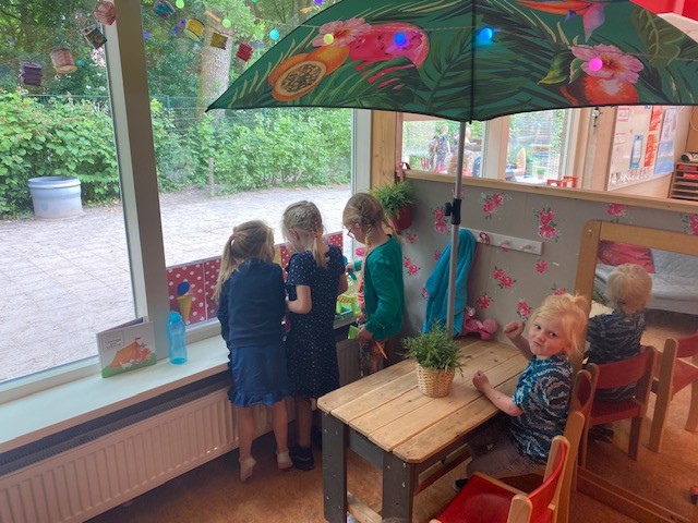 Binnen is onze huishoek veranderd in een camping. Er staat een tent met allerlei vakantiebenodigdheden zoals een koffer, een tas met handdoeken en een zwemband. Ook is er een ijscowinkel. Hier kunnen de kinderen de lekkerste coupes maken.
