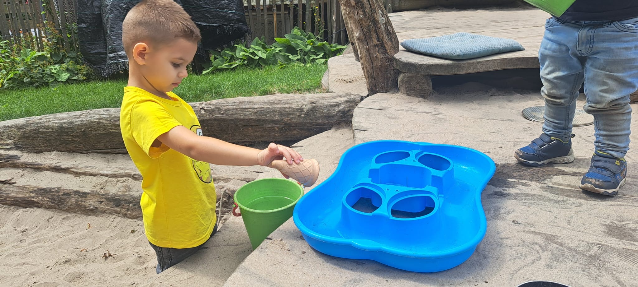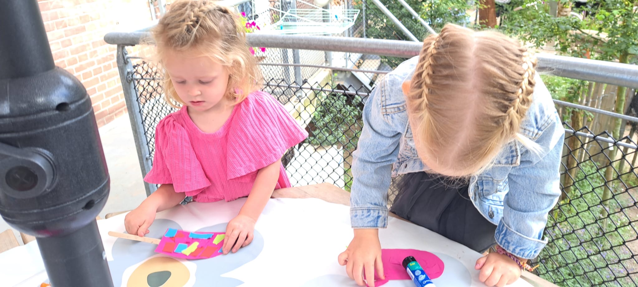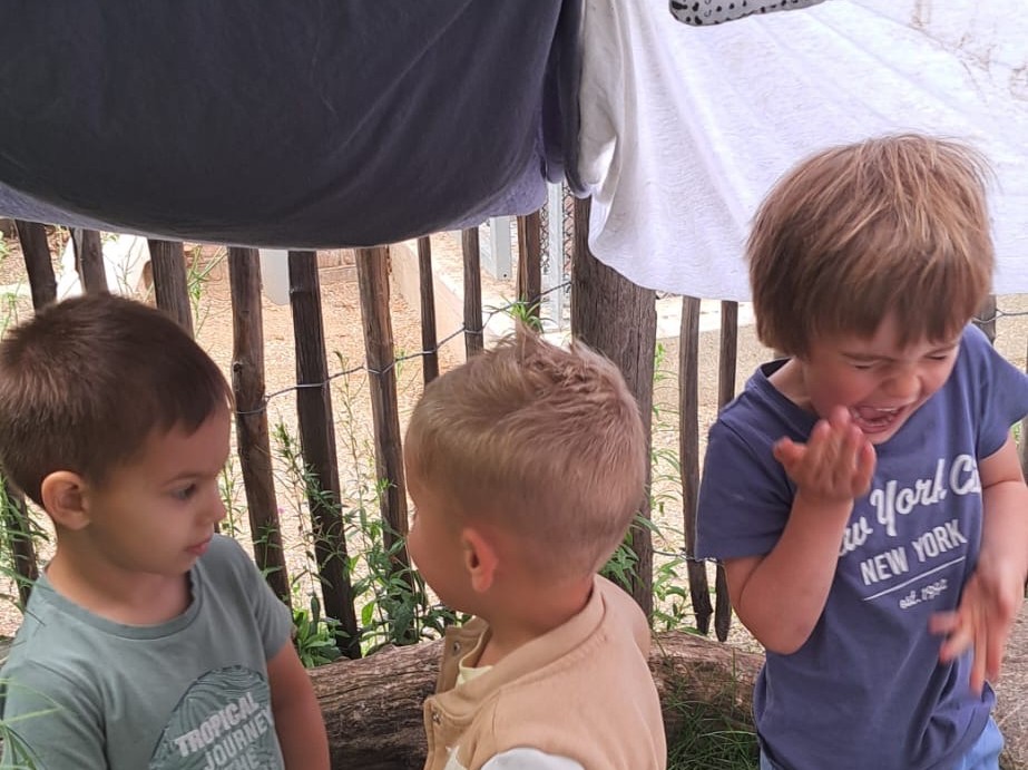 Buiten maken we zelf een tent van oude lakens. We spelen in de zandbak, soms ook met water, en we knutselen met mooi weer ook buiten.