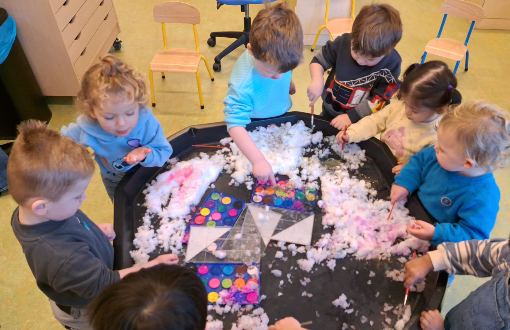 Het nieuwe jaar zijn we begonnen met een dik pak sneeuw. De peuters van peuteropvang De Buurtkabouters hebben hier volop mee gespeeld. Zowel buiten, dik ingepakt, als binnen. Want sneeuw kan je ook naar binnen halen. We hebben samen gekeken wat er met de sneeuw gebeurt op de groep. Het is warmer dan buiten en het gaat smelten. Opeens is er dan water in de bak en de sneeuw is verdwenen. Dit alleen al is verwondering bij peuters. In de tuff-tray gaan we de sneeuw verven. De peuters ontdekken dat de verfvlekken steeds groter worden en ook door elkaar heen gaan lopen.