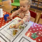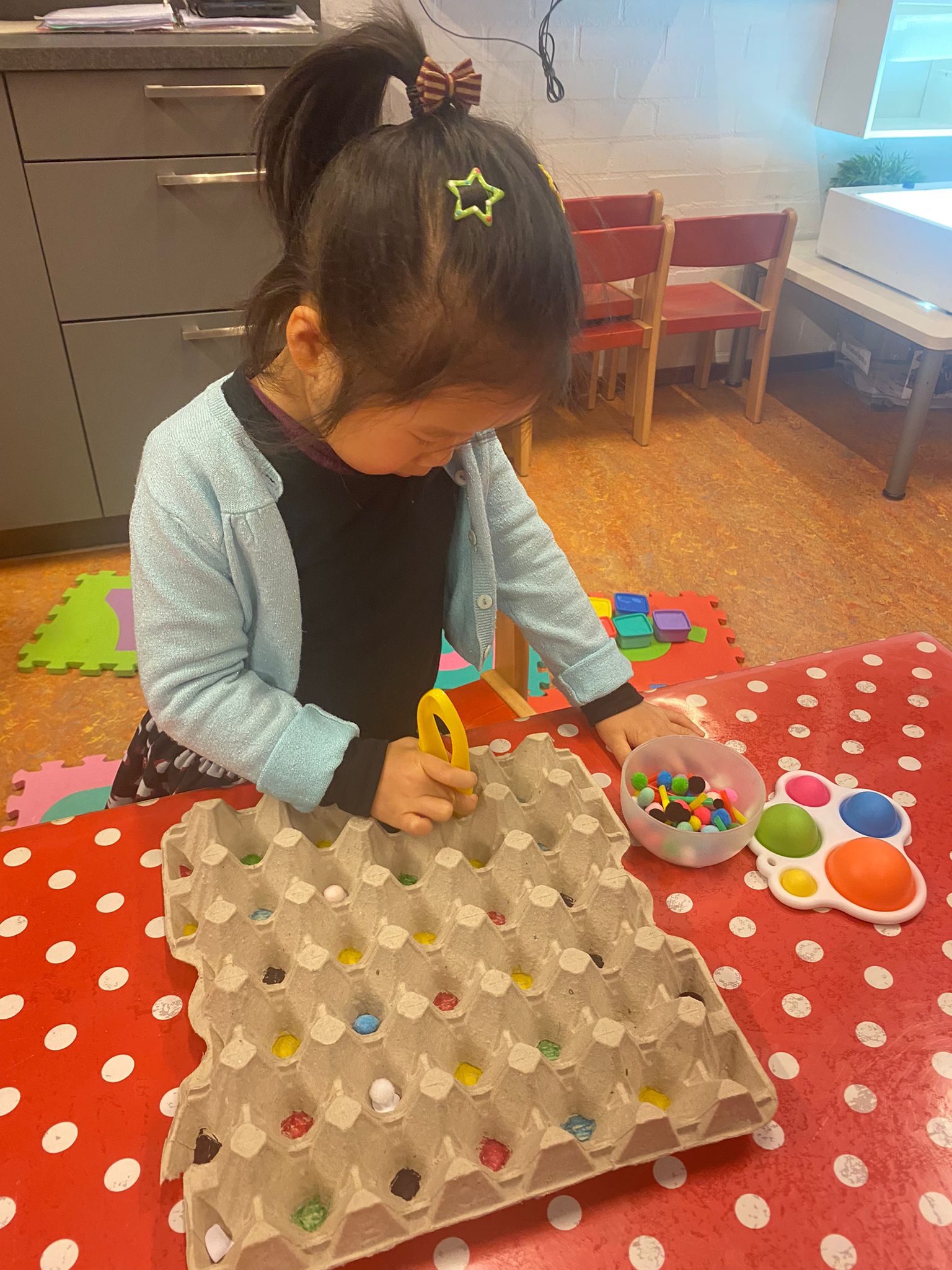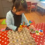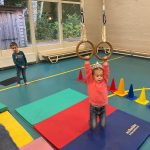 In de gymzaal dobbelen wij met de dobbelsteen en tellen wij het aantal stippen. Daarna pakken de peuters zelf het aantal herfstfiguurtjes wat met de dobbelsteen gegooid is en leggen dit in het vak op de grond.