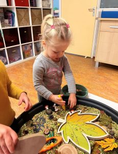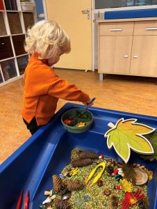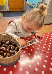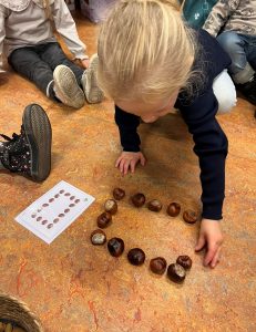 Met de gevonden eikels en kastanjes wordt in de kring een spel gespeeld. Op de plaatjes wordt goed gekeken wat erop staat en het bijpassende herfstvoorwerp erop gelegd. Zo maken de peuters verschillende reeksen met de eikels en kastanjes. Ook worden er vormen gemaakt met de kastanjes, zoals een vierkant en een cirkel.