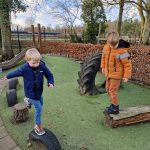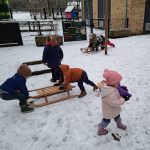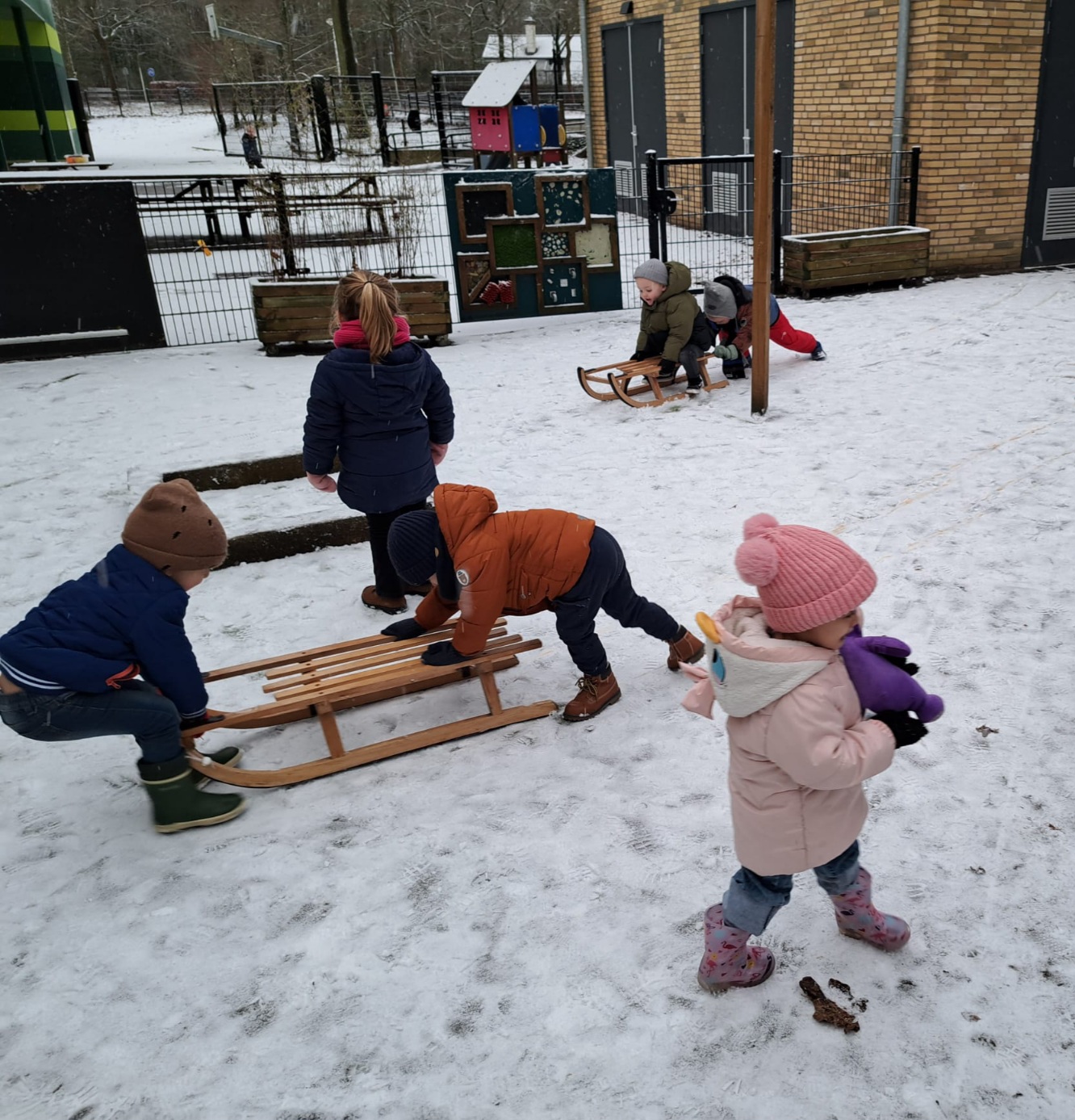 Op het plein van De Buurtkabouters ligt dagenlang een laagje sneeuw waar we heerlijk in spelen. Vanwege de kou hebben de kinderen mutsen, dassen en handschoenen bij zich en dat moet natuurlijk allemaal aan. Hoewel we stimuleren zoveel mogelijk zelf te doen, vraagt dit toch wel onze hulp. Buiten wordt de slee erbij gepakt en de peuters zitten er om de beurt op en duwen of trekken elkaar, wat nog niet meevalt. We hebben bij de glijbaan een kleine helling en die is natuurlijk helemaal leuk om vanaf te glijden. Ook met scheppen en bezems zijn de peuters druk in de weer. En natuurlijk de sneeuw naar elkaar en ons toegooien. Wat een sneeuwpret!