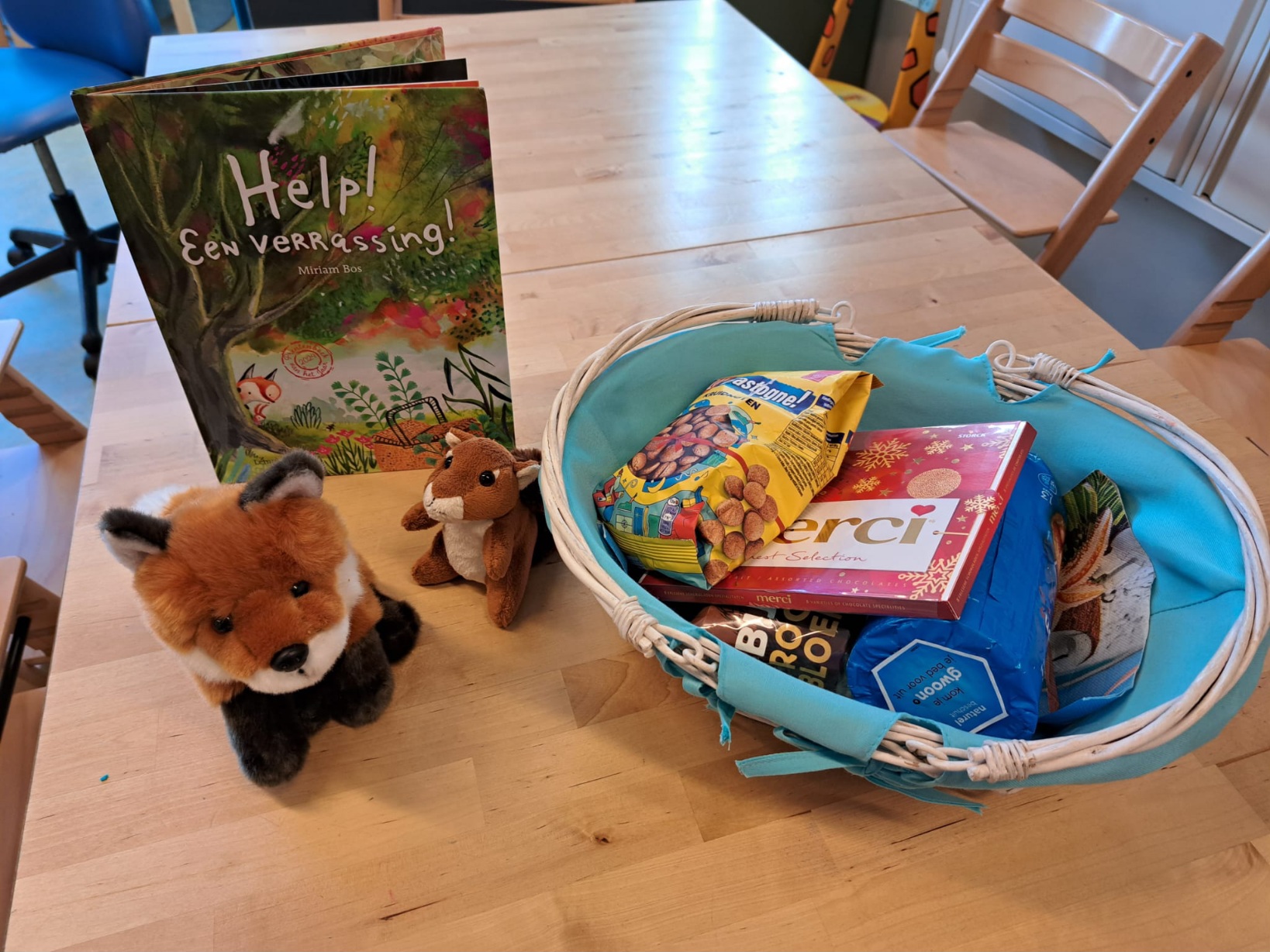 We zijn met ons nieuwe thema begonnen. Help! Een verrassing! Dit is het boek dat centraal staat tijdens de Nationale Voorleesdagen (24 januari t/m 4 februari). Het gaat over een vos, die een verrassing krijgt van zijn vriendinnetje de eekhoorn. Maar wat is nou die verrassing? Vos vindt het spannend want eekhoorn houdt van wilde, drukke activiteiten en hij meer van rustige, veilige dingen doen. Uiteindelijk is de verrassing een picknick.