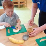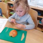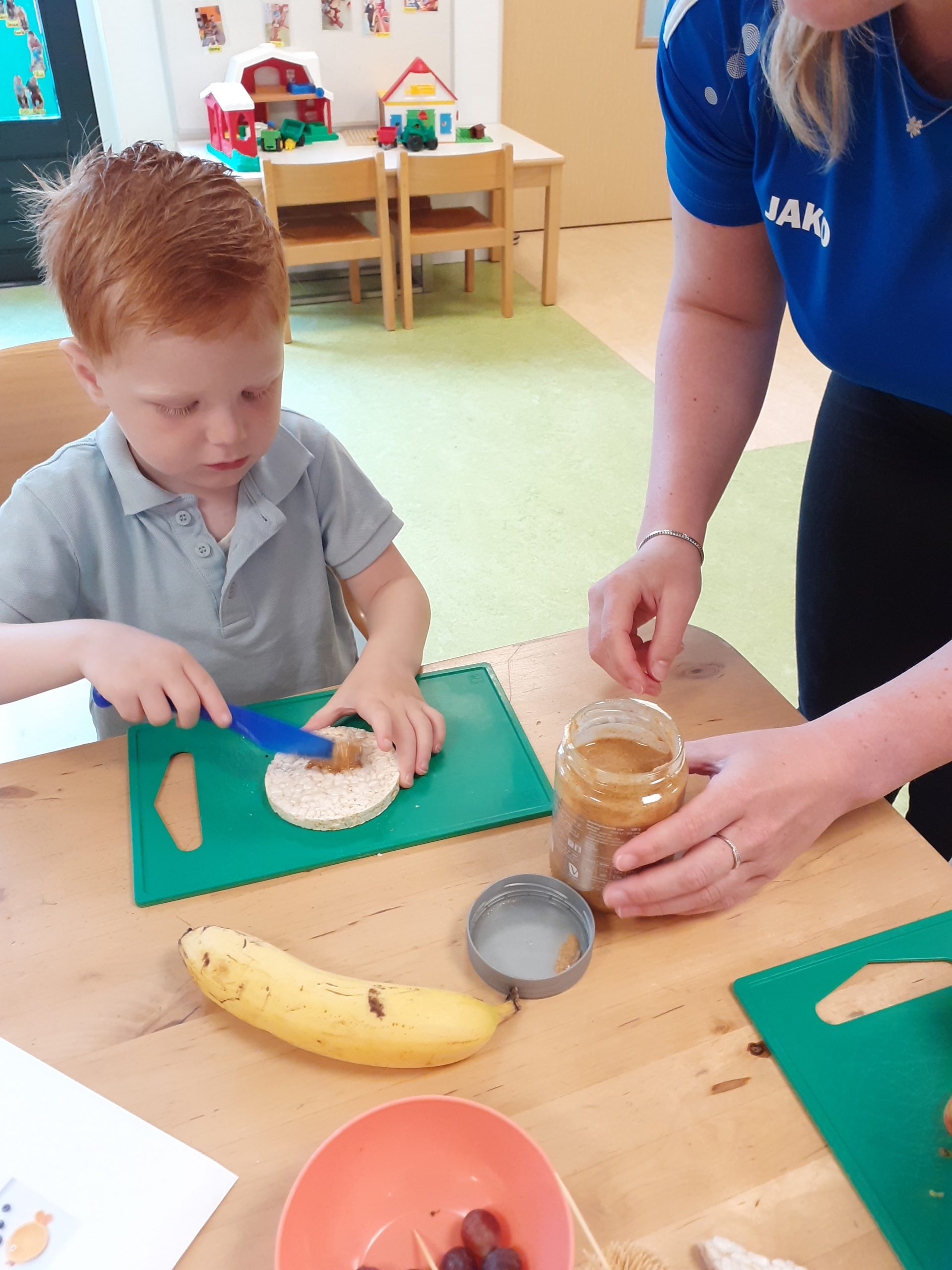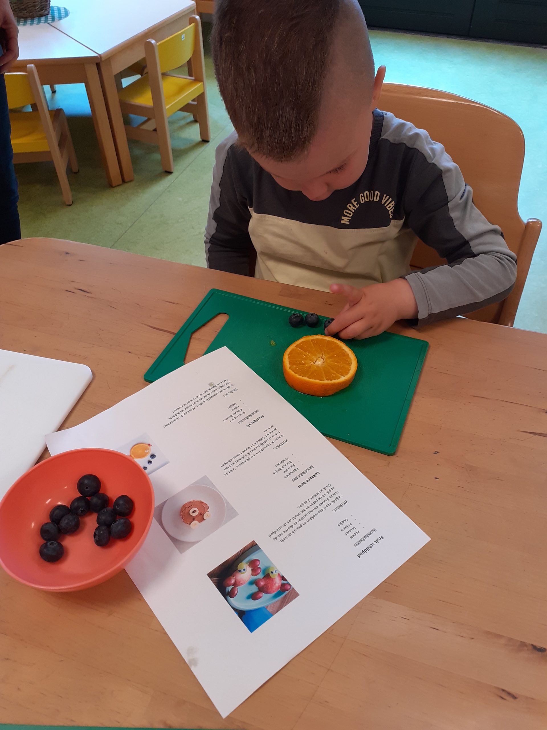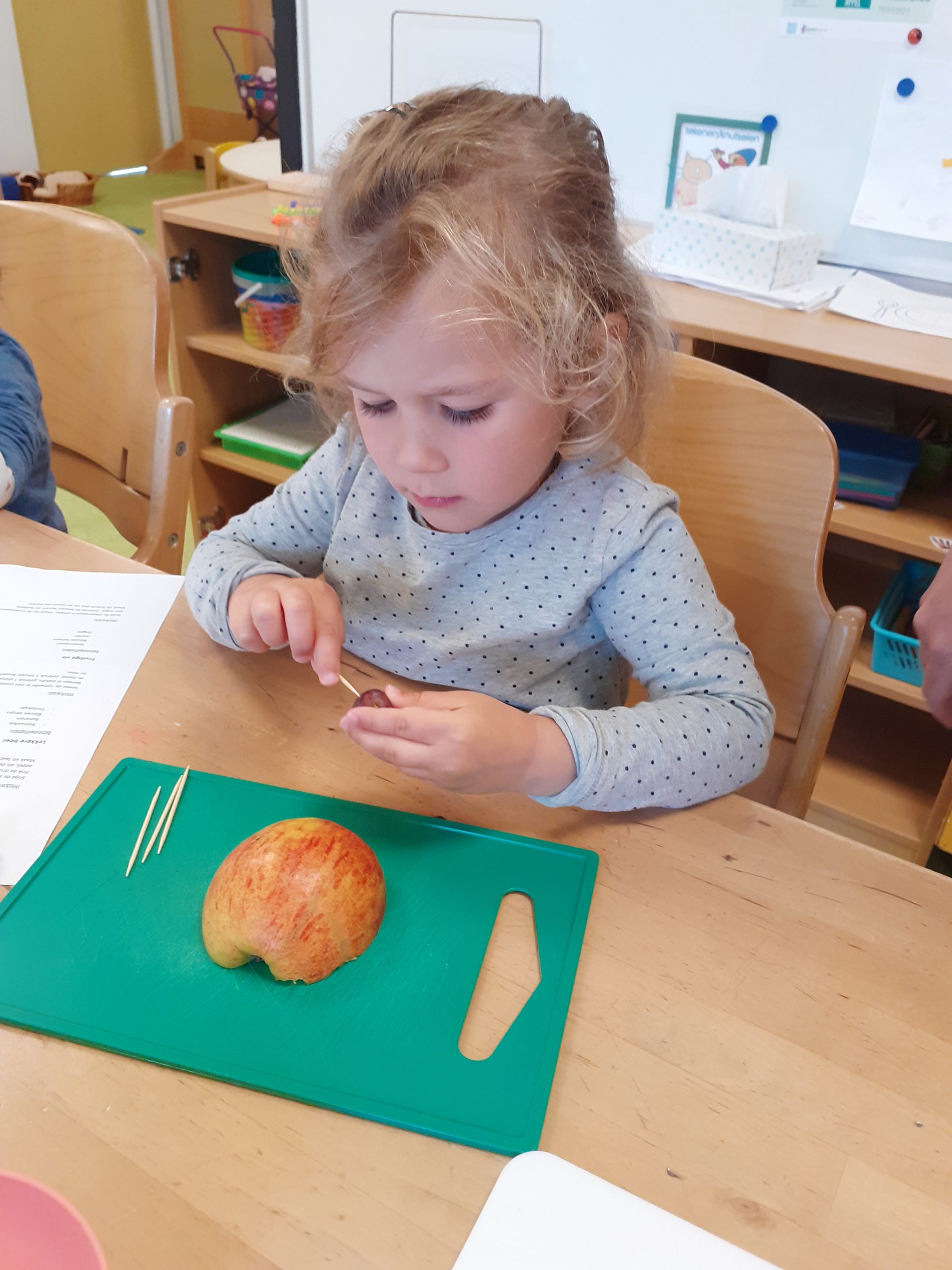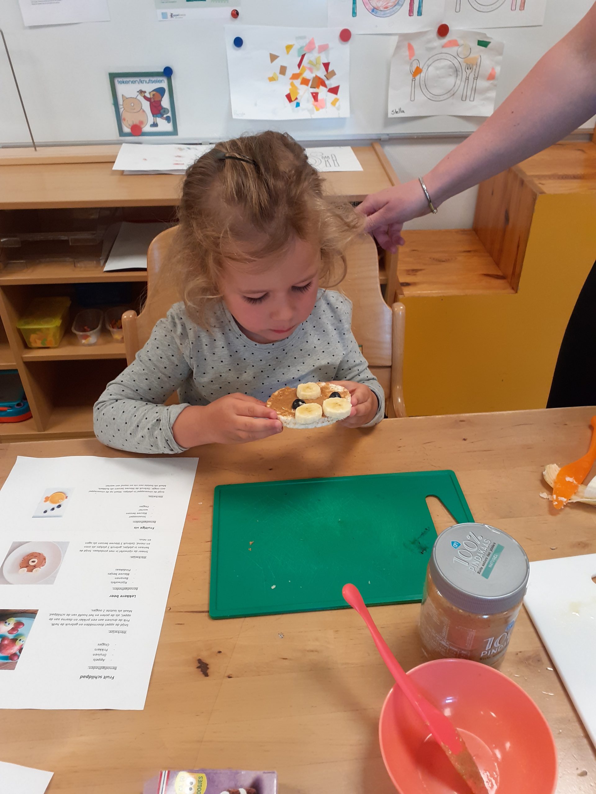 De peuters vertelden dat ze thuis op hun broodje o.a. (smeer)kaas, pindakaas, gestampte muisjes, vruchtenhagel en worst eten. Maar ook appel, peren, aardbeien, bananen en komkommer wordt veel gegeten. Om het gezonde fruit een beetje in de belangstelling te brengen, hebben we samen met Amy (buurtsportcoach) leuke fruit/groentehapjes gemaakt! De kinderen vonden het heel leuk om te doen en ook om te proeven en op te eten. Zo zijn we op een speelse manier heel gezond bezig geweest.