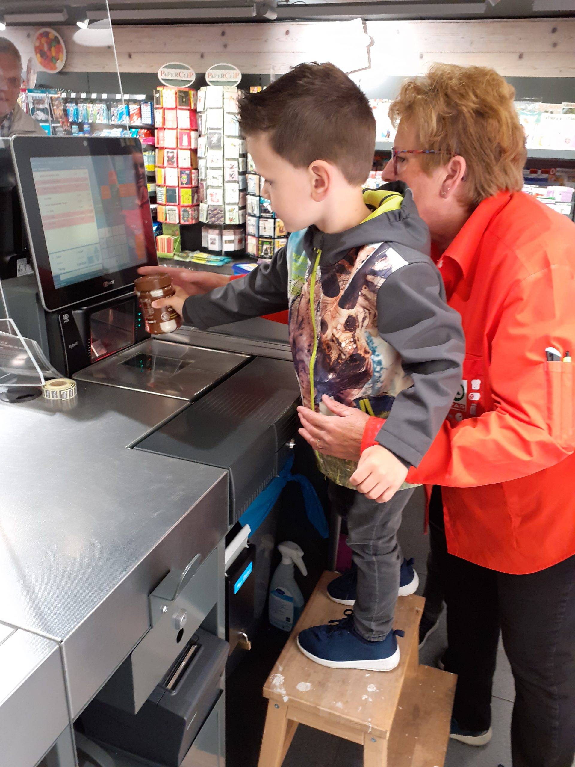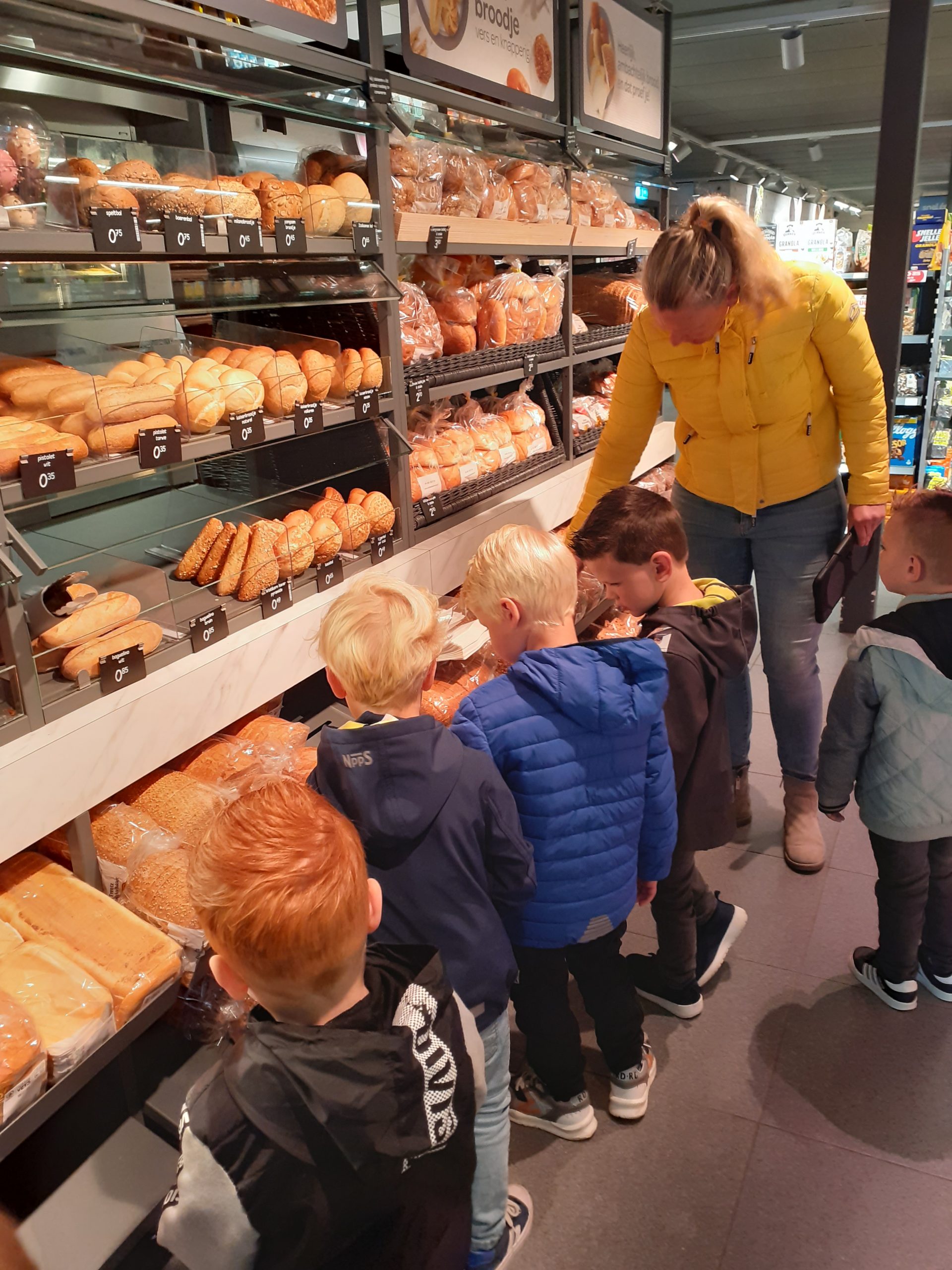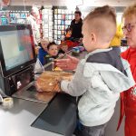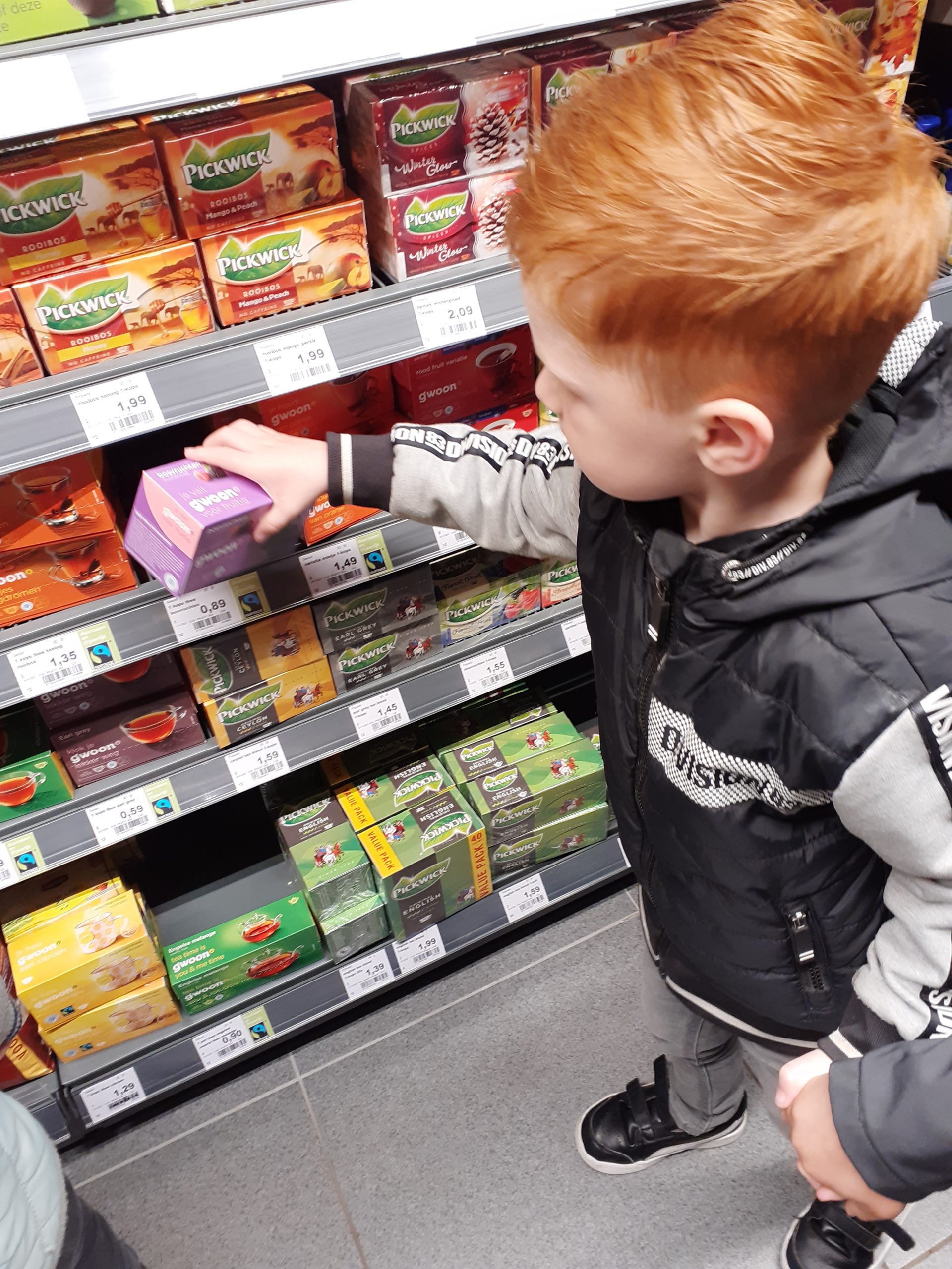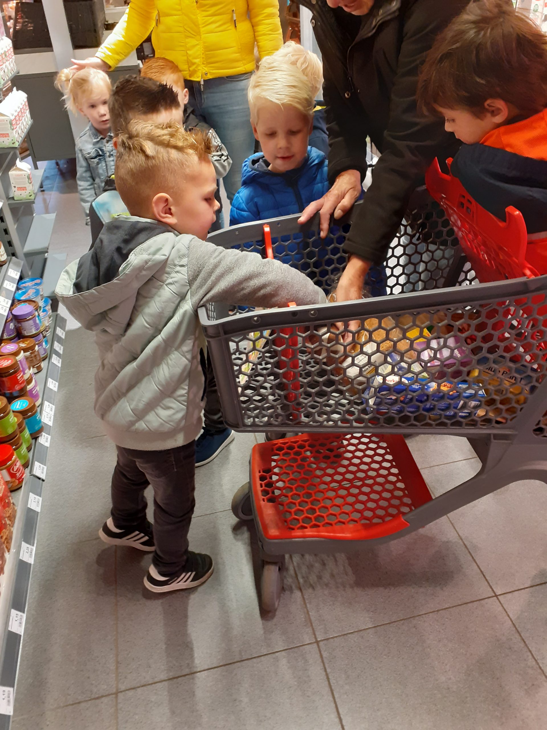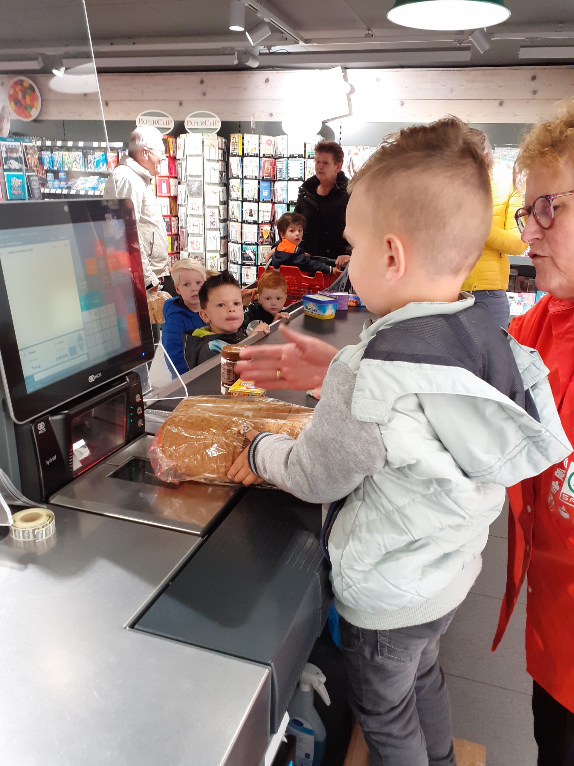 In de huishoek zijn pannenkoeken en taarten gebakken maar ook werd er macaroni klaar gemaakt. Bordjes, lepels klaarzetten en samen gezellig eten! Maar waar komt het fruit wat we in de kring eten en het broodje met boter en beleg tussen de middag, vandaan? In Emst toch wel bij de Spar! Ons brood en fruit was op, dus op naar de winkel. Samen een lijstje gemaakt, tas mee en op weg. Bij de Spar pakten de peuters zelf de boodschappen uit de schappen en in de kar. Bij de kassa mochten ze zelf de boodschappen scannen en weer op de band leggen. In de tas, met de pas betalen en terug naar ’t Muizenholletje!