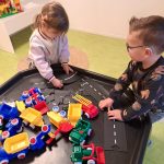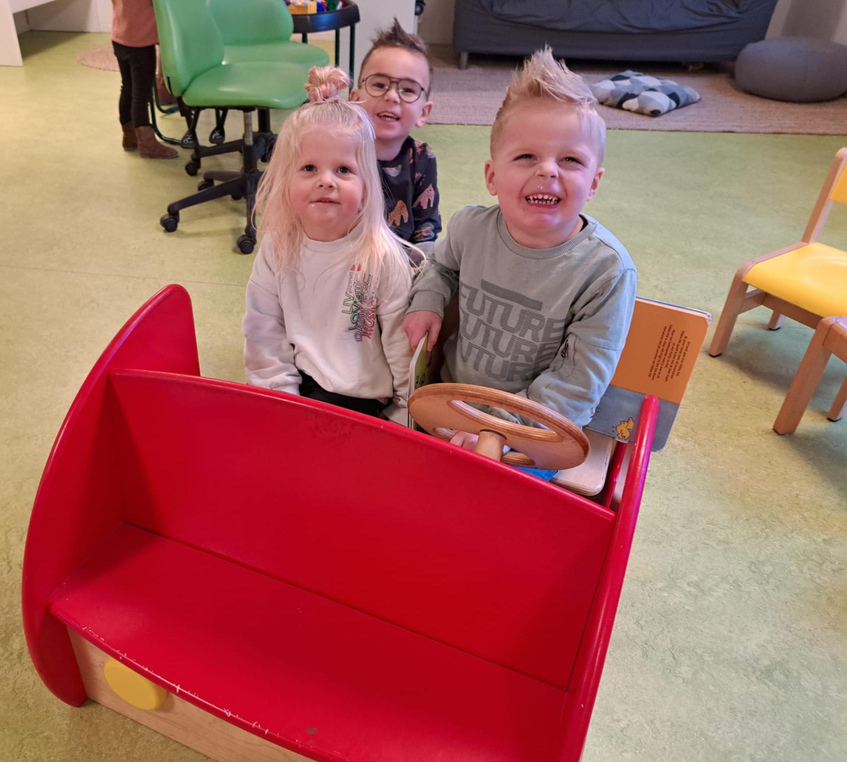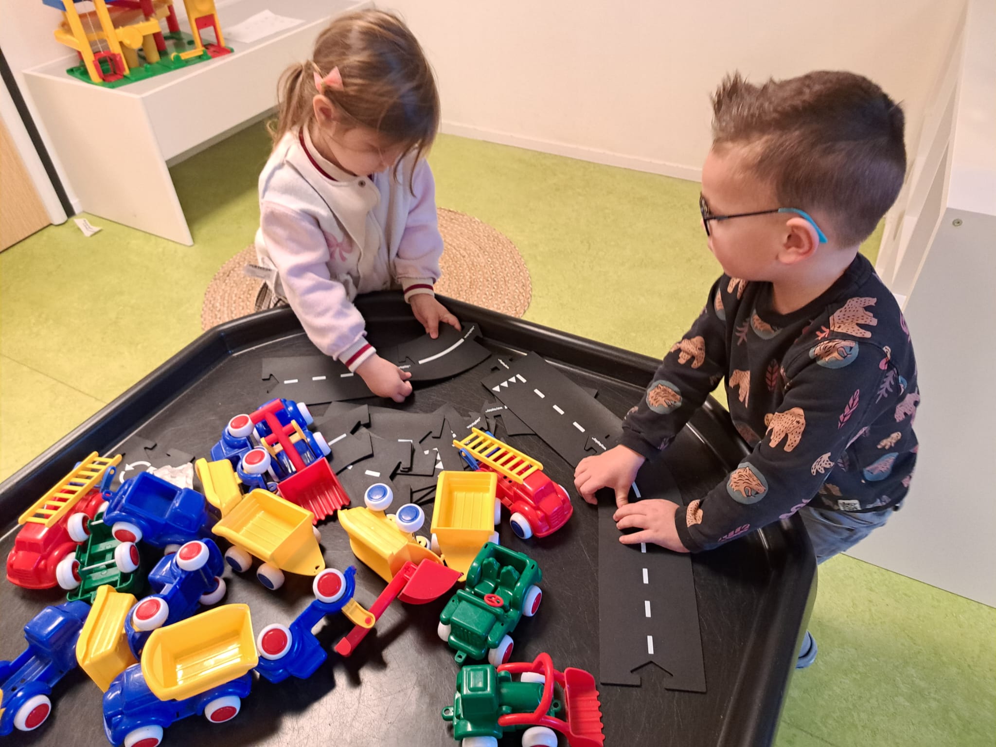 De kinderen mogen met de grote auto spelen en ook hebben we in de bouwhoek een bak met auto’s en losse wegdelen neergelegd. De kinderen kunnen daar bijvoorbeeld spelen dat ze een echte weg maken en auto’s besturen.