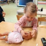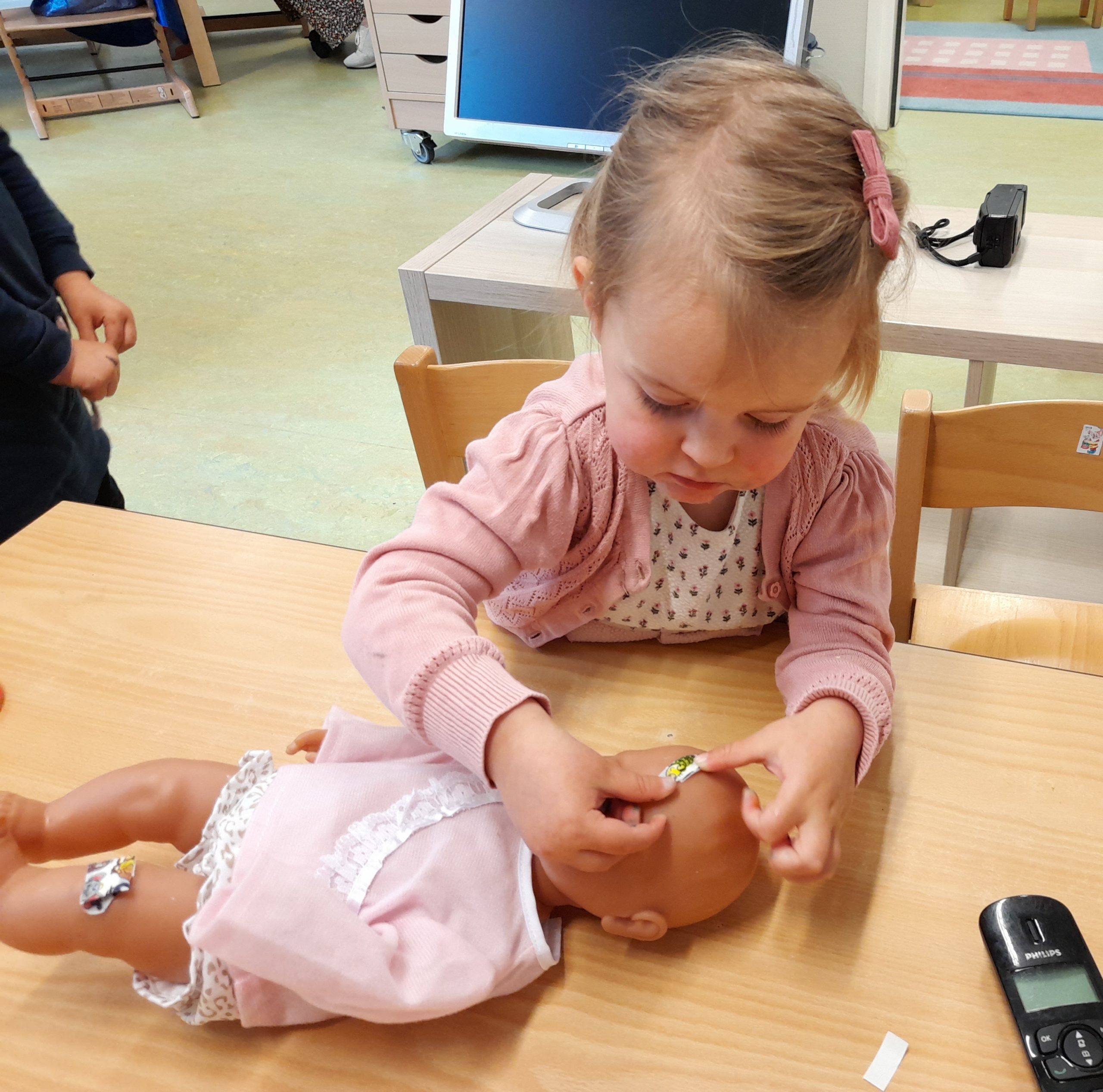 Aan de hand van een logo3000 plaat beelden we uit (met een pop) wat er gebeurt als je je stoot. De pop heeft bloed en er wordt een pleister geplakt. Dit spelen de peuters later na in de huishoek. Er is een bak vol met pleisters en die worden volop gebruikt. De pleister uit de verpakking halen vraagt concentratie en daarna op de pop plakken. Ondertussen vertellen ze waar de pop pijn en bloed heeft en zo komen veel lichaamsdelen al spelend aan bod.