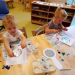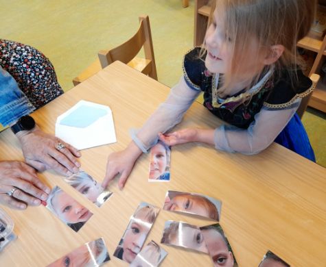 Van alle kinderen hebben we een foto van hun gezicht genomen en daar een puzzel van gemaakt, door de foto doormidden te doen. Als we maar een deel laten zien, raden de meeste kinderen toch welke peuter het is, heel knap. Samen zoeken we de twee goede helften bij elkaar. En als grapje doen we ook wel eens twee verkeerde stukken tegen elkaar. Letterlijk krijg je dan een “raar gezicht” en dit levert veel gesprekstof op. Praten over de verschillen in haar, ogen, neus, mond etc. Zo ervaren ze dat niemand hetzelfde is.
