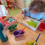Zo hebben we tegelijkertijd alle kleuren benoemd en gebruikt. Met een verfschort aan zijn ze hier heel mooi mee bezig geweest. Sommige peuters hadden dezelfde kleur als het cadeau! Daarna hebben we een mooie kleur papier uitgezocht en hebben de peuters geholpen met inpakken. Daarna een mooi hart voor mama gekleurd en aan het pakje gehangen. Toen mocht het mee naar huis en gingen ze het goed verstoppen voor mama. Onder het bed, in hun eigen kast of sommigen achter het gordijn.