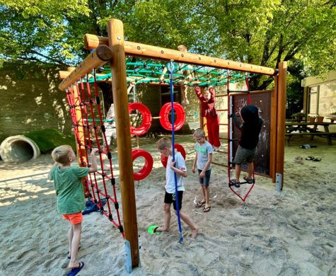 Tijdens de vakantiebso (bij BSO Kierewam) in de zomervakantie hebben de kinderen al kennis kunnen maken met het nieuwe klimtoestel op ons plein. Nu klimmen en klauteren ze er elke dag naar hartenlust op. Ook kan het gebruikt worden om hutten onder te maken. Of lekker even chillen na een drukke dag op school.