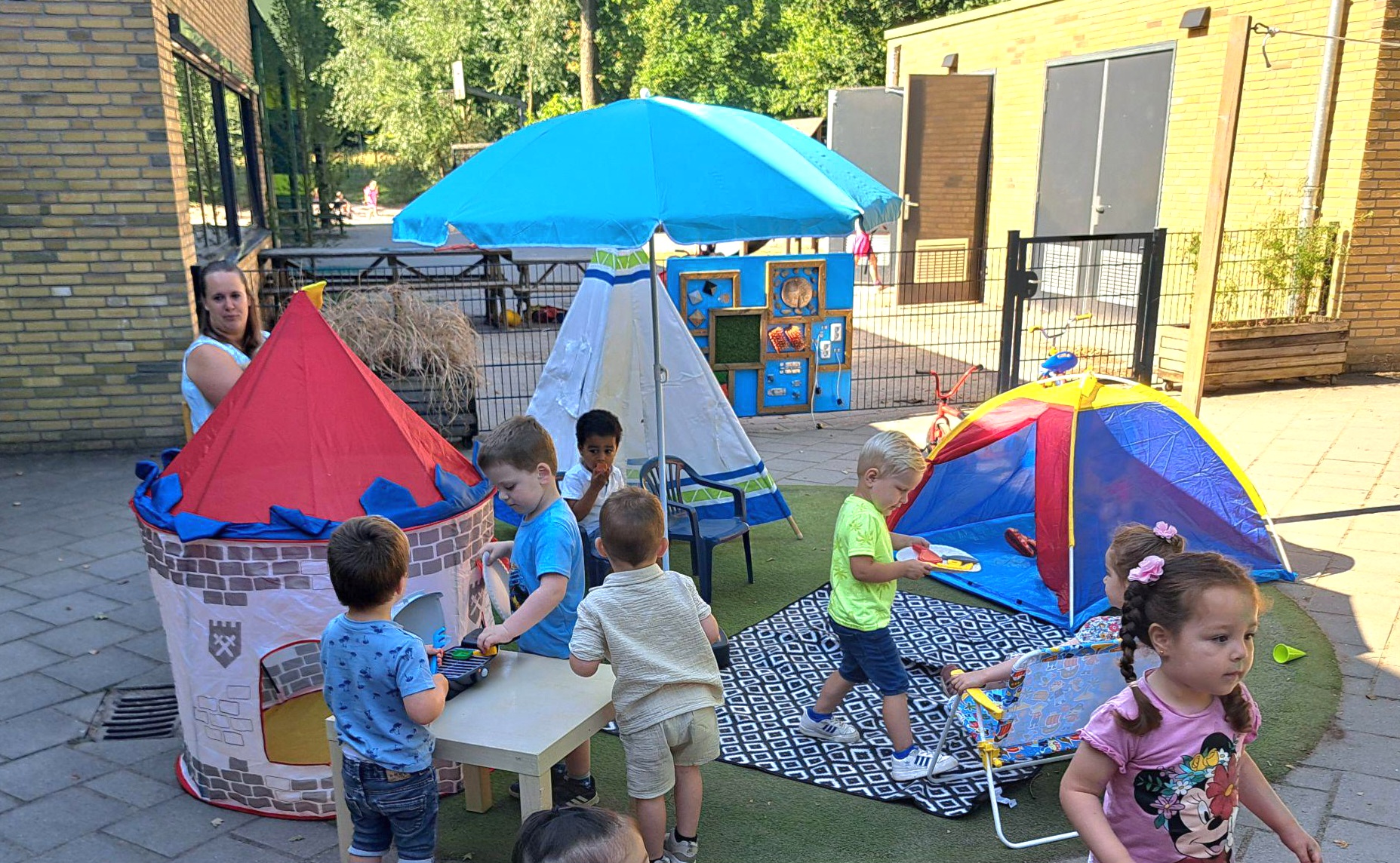 We zijn nog bezig met het boek van Boer Boris gaat naar zee. Boer Boris gaat op vakantie naar zee. Ook de peuters gaan op vakantie en daarom hebben we buiten een camping gemaakt. De peuters hielpen met tentstokken in elkaar zetten en in de tent schuiven, een picknickkleed neerleggen, parasol uitklappen, stoeltjes neerzetten en zelfs de barbecue staat op een tafeltje erbij. Er wordt volop rollenspel gespeeld.