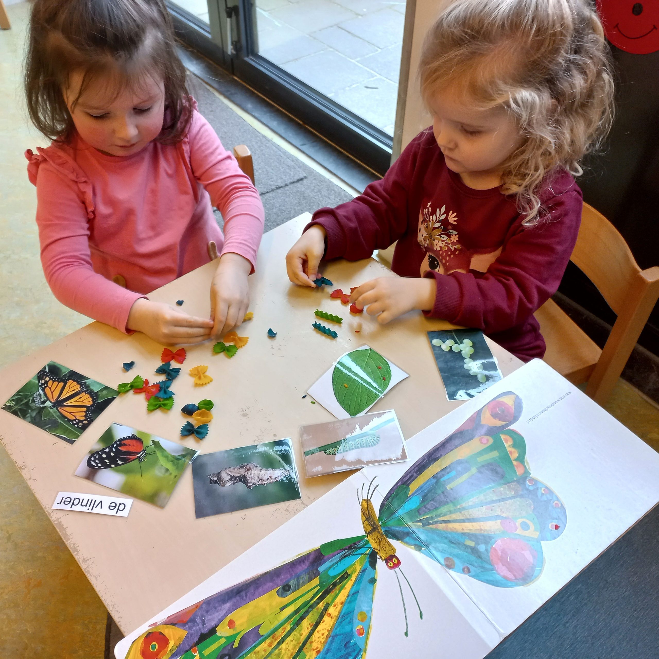 De rups maakt uiteindelijk een cocon en blijft daar meer dan 2 weken inzitten om er als een mooie, gekleurde vlinder uit te komen. We bekijken foto’s van rupsen, een cocon en veel vlinders. We hebben een bak met gekleurde rijst en macaroni om de ontwikkelingsstadia uit te beelden. Hier kunnen we mee sorteren op volgorde van ontwikkelingsstadia maar ook op kleur. Gelijktijdig komt het tellen dan ook weer aan bod. Ook knutselen de peuters zelf een cocon, door dikke wol om een wc-rolletje te wikkelen.