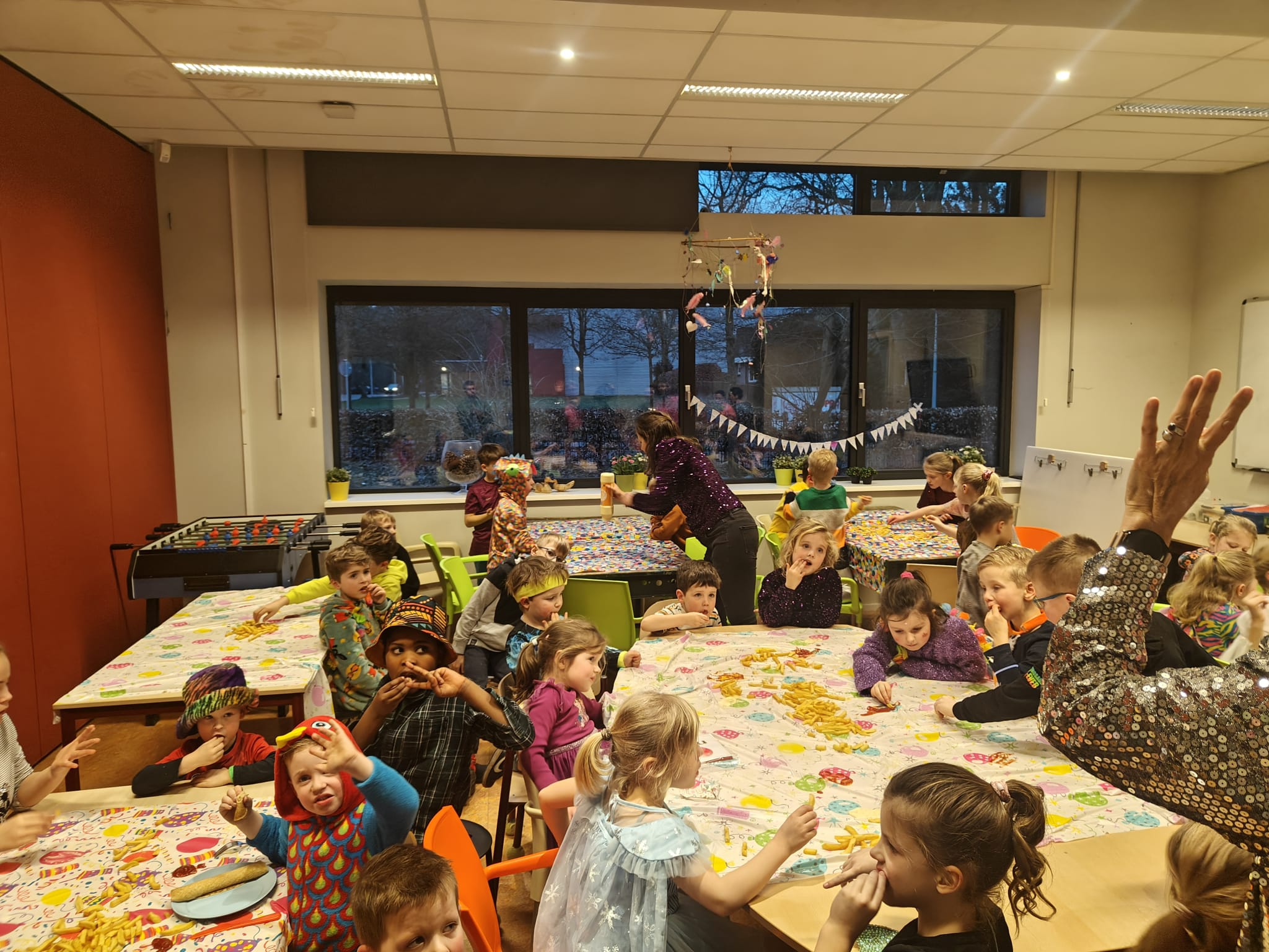 Vooraf hebben we samen met alle kinderen heerlijk patat gegeten en genoten van ranja of water om ons klaar te maken voor het dansspektakel.