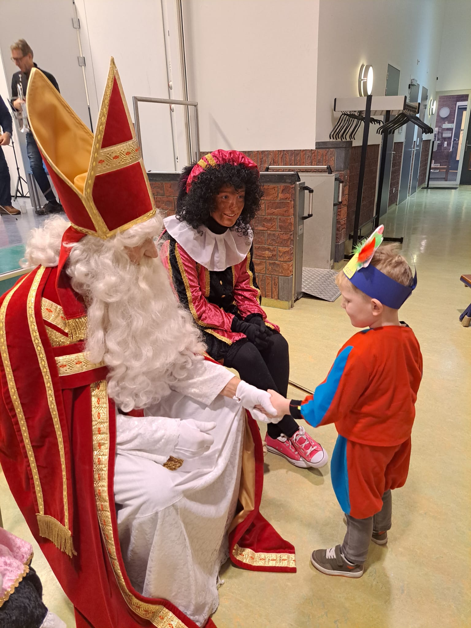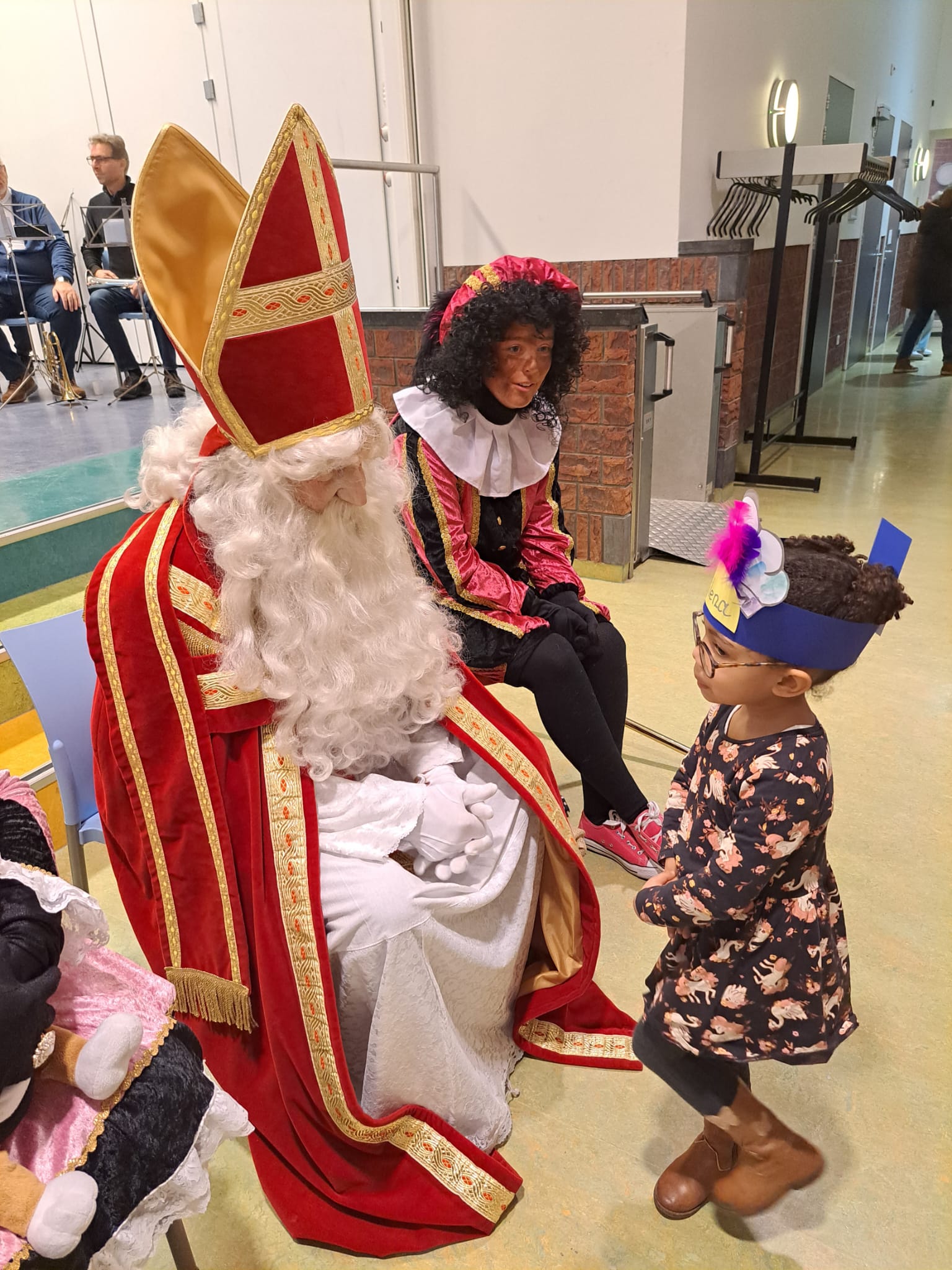De leerlingen van de basisschool verzorgen per groep een mooi optreden voor de aanwezigen. Daarna was er voor de peuters tijd om even samen te zijn met de Sint en zijn Pieten en dat vinden een aantal peuters best een beetje spannend.