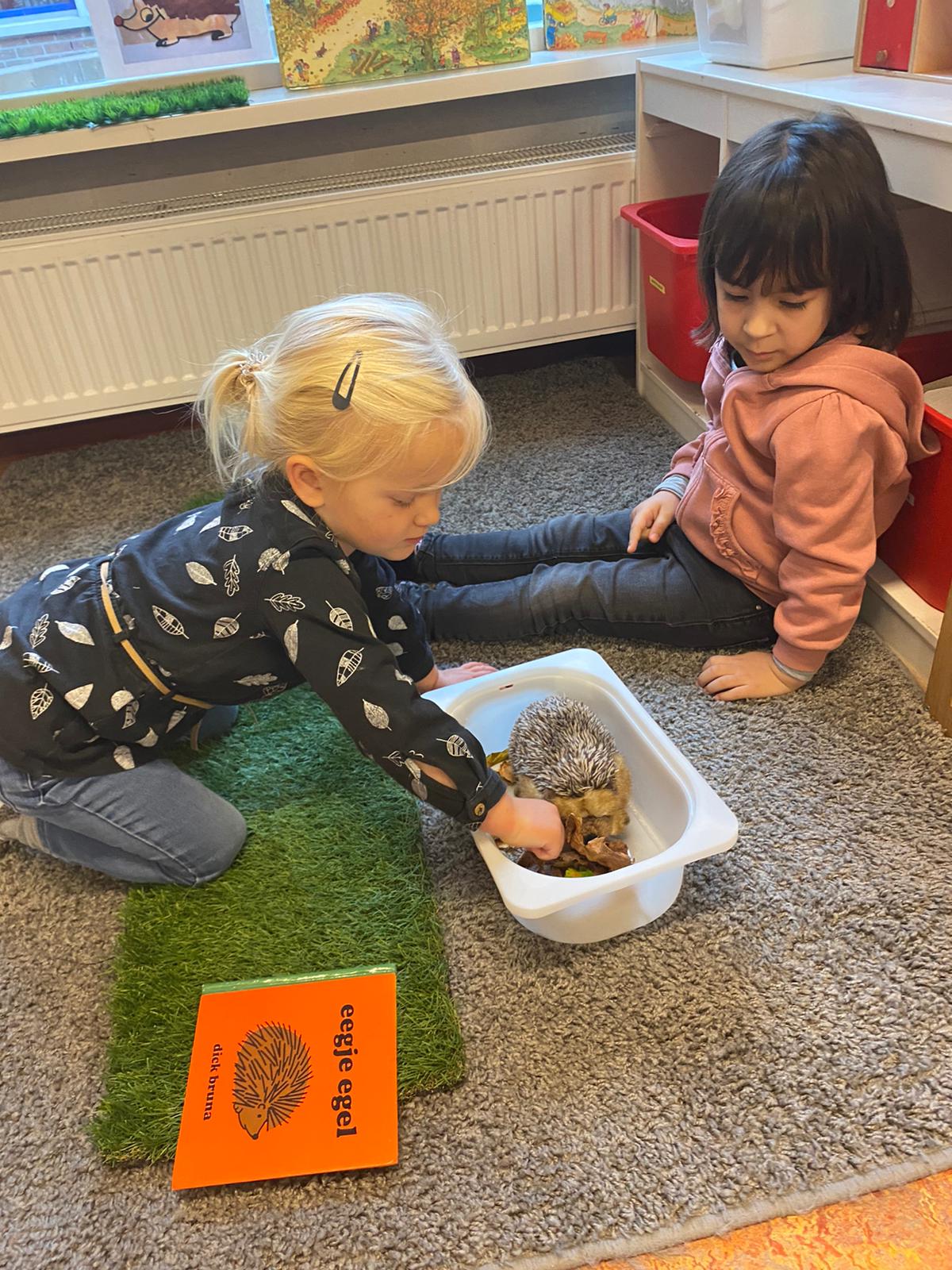 Eerst hebben we het gehad over de egel. Hoe leeft hij en hoe ziet hij eruit? Hoe voelt hij aan? De kinderen hebben gezorgd voor een (nep)egel. Wat water in een bakje en de egel onder de blaadjes verstopt.