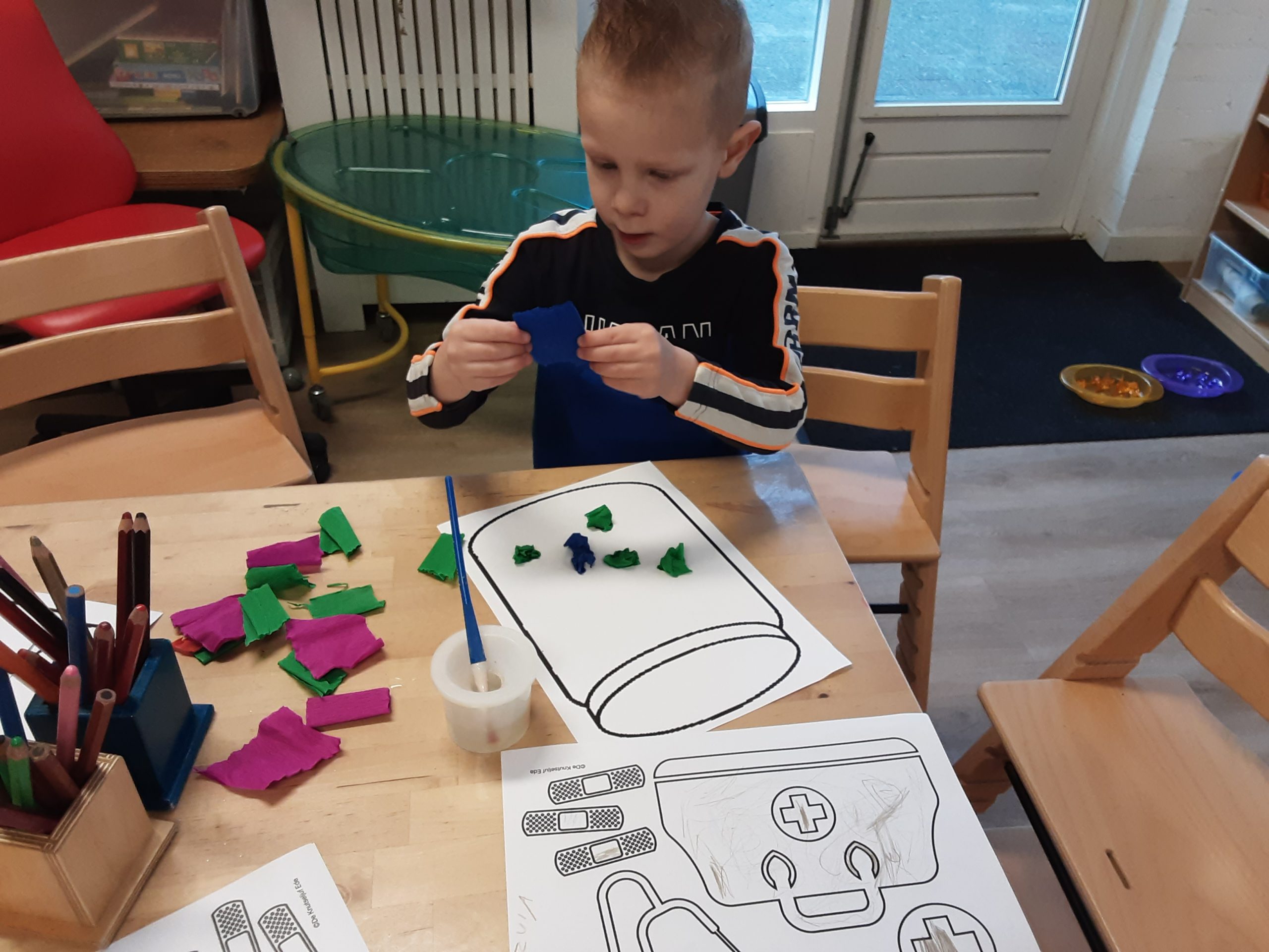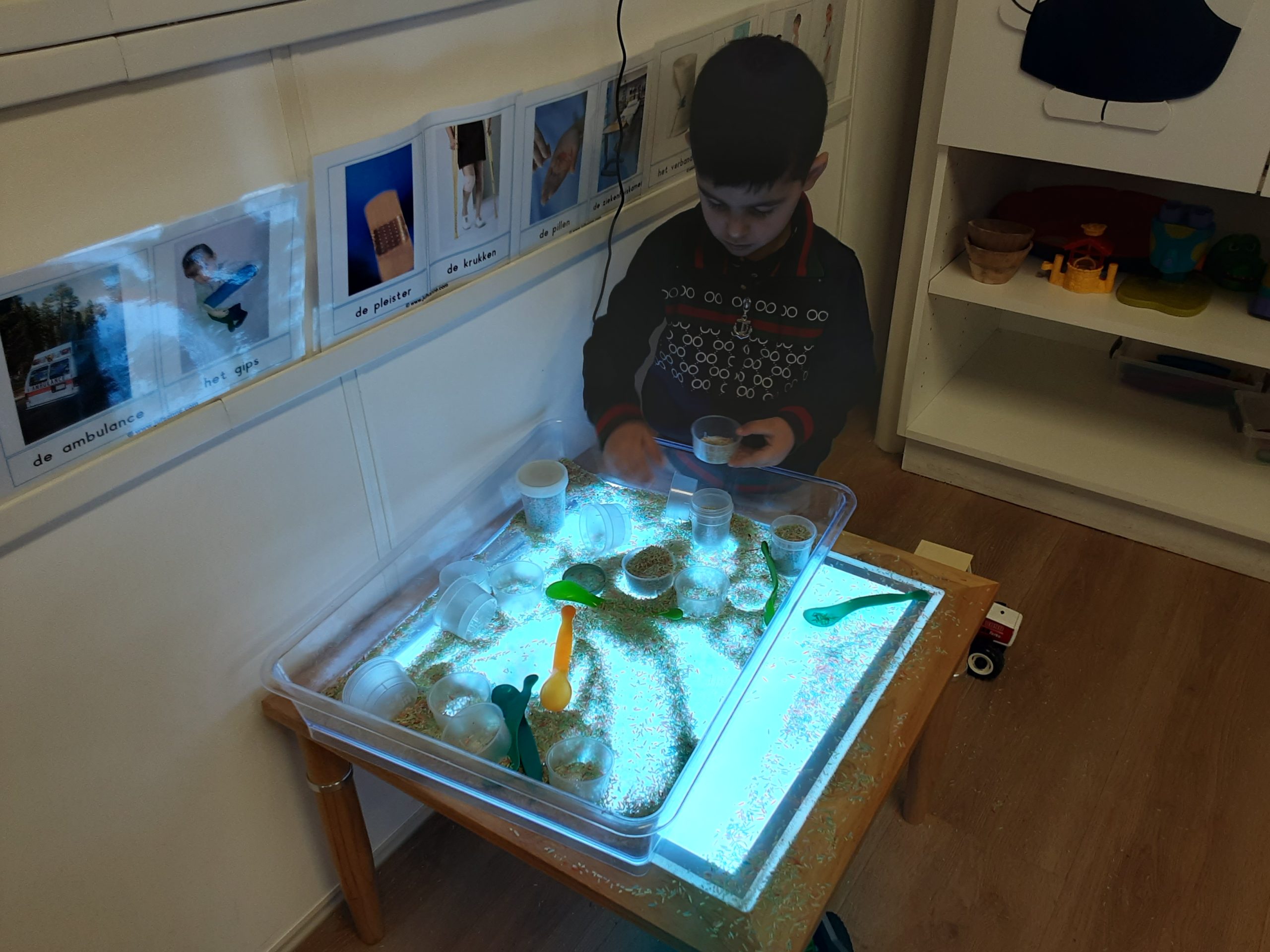 Op de lichttafel kunnen de peuters medicijnpotjes vullen met ‘pilletjes’ (gekleurde rijst). Hier zijn ze heel druk mee! Spelen met gekleurde rijst is een zintuiglijke activiteit die de beleving stimuleert met kijken, voelen, horen en fantasievol spelen.