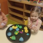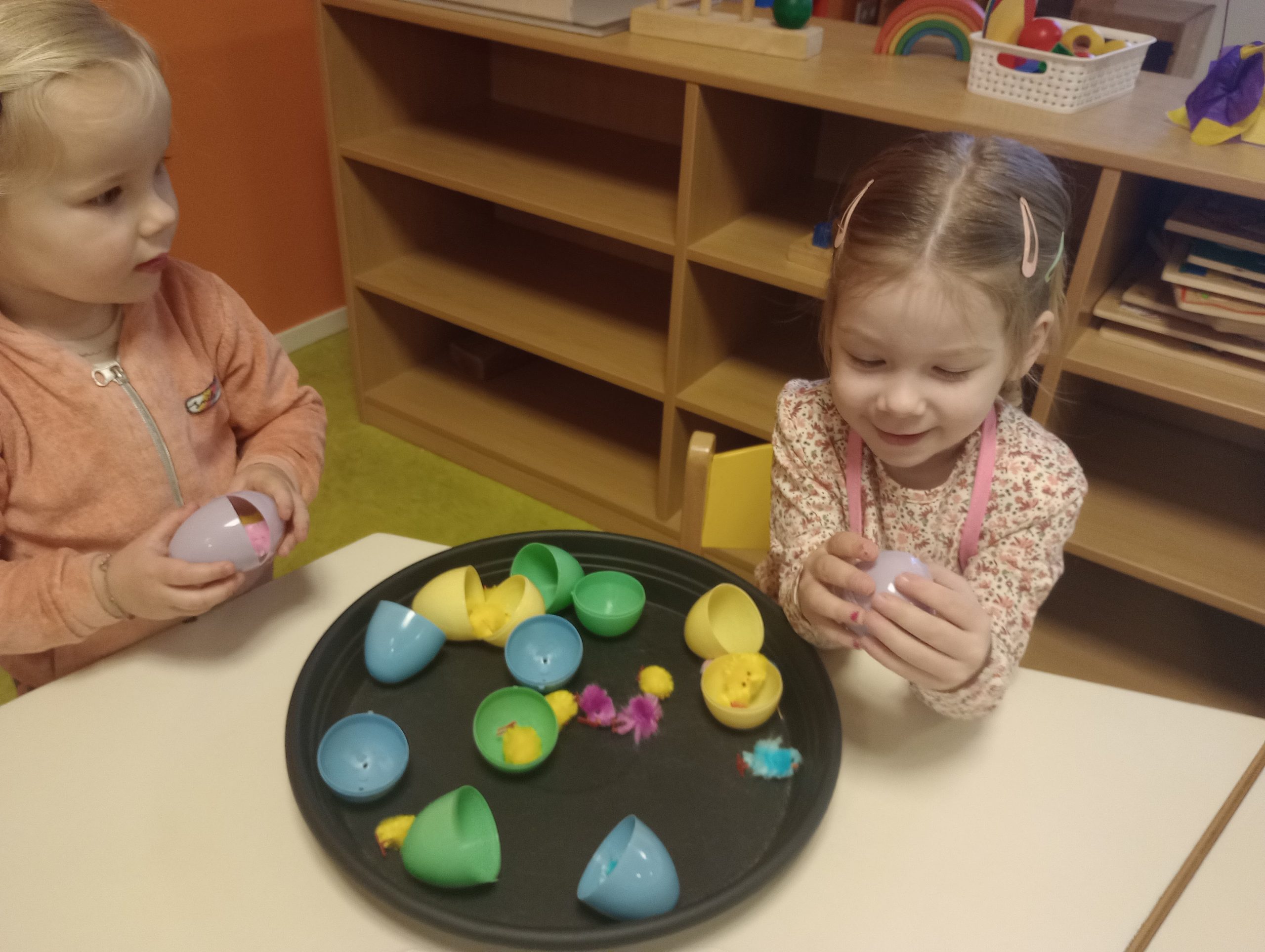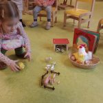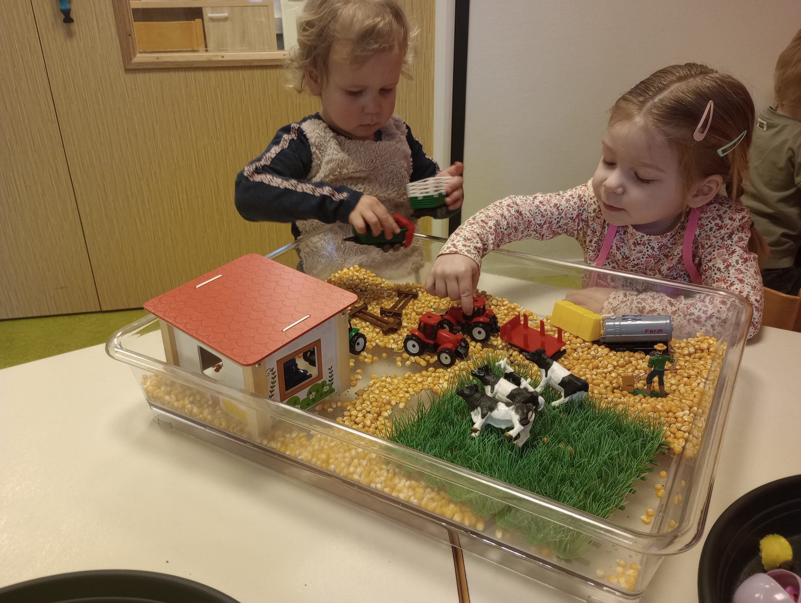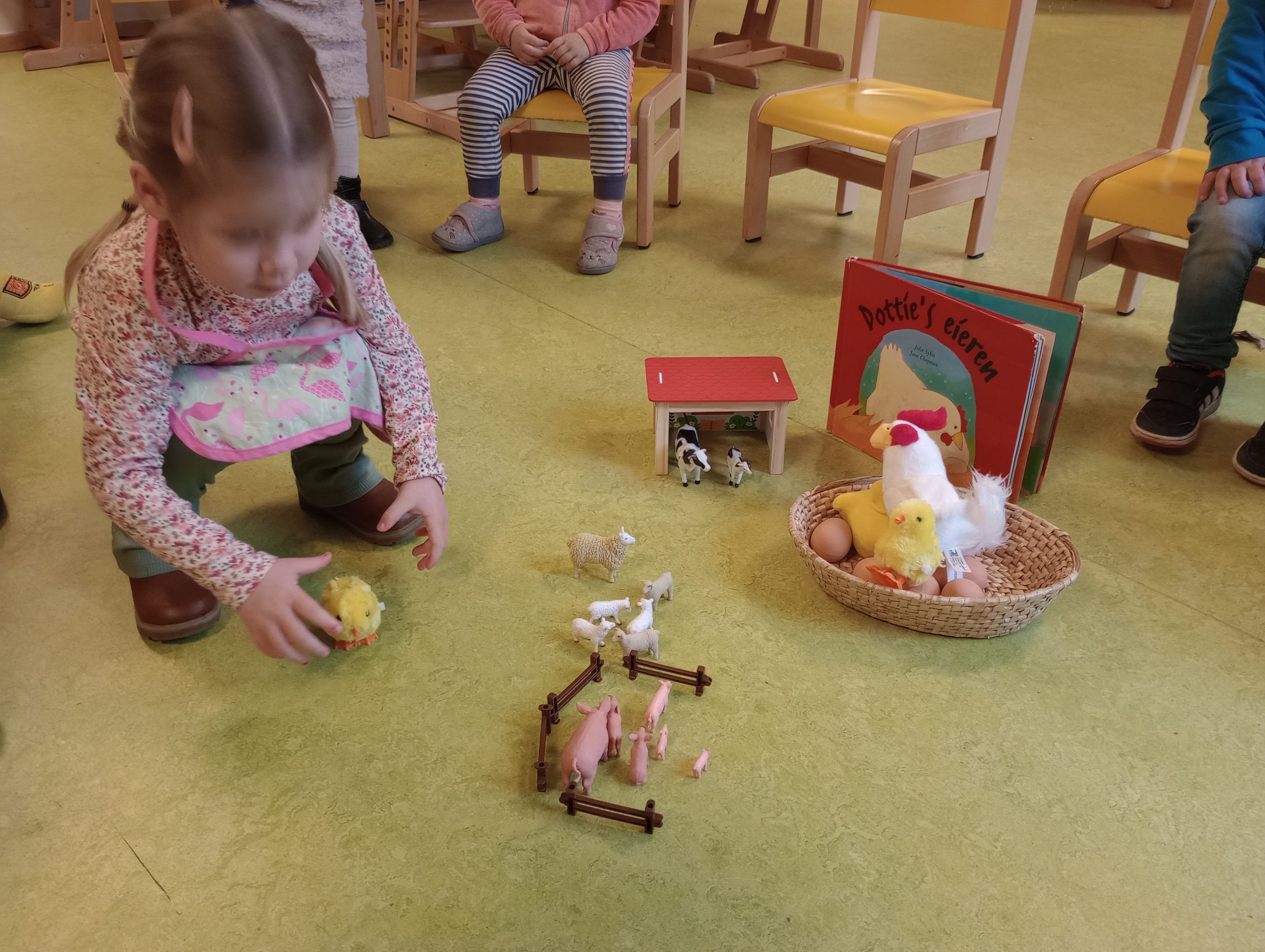 Het boek wordt voorgelezen in de kring. Wij praten over wat we zien op de plaatjes en wij spelen samen met de materialen en dieren die voorkomen in het boek! Wij hebben ook leuke speelbakken op de groep. Een bak waar de kinderen gekleurde kuikentjes en eieren kunnen sorteren op kleur. En een bak met speelmais, jonge boerderijdieren en tractors.