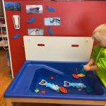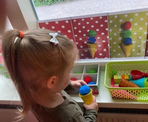 Binnen is onze huishoek veranderd in een camping. Er staat een tent met allerlei vakantie benodigdheden zoals een koffer, een tas met handdoeken en een zwemband. Ook is er een ijscowinkel. Hier kunnen de kinderen de lekkerste coupes maken. Er hangen foto’s bij van heerlijke ijsjes met verschillende bolletjes. Samen tellen we hoeveel bolletjes ijs er op het hoorntje zitten.