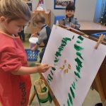 Op de schildersezel hebben ze zelf een kerstboom mogen verven. Eerst goed kijken hoe de boom er eigenlijk uitziet en hoe ga je die dan met verf maken. De boom is groen, dus met groene verf allemaal takken maken.