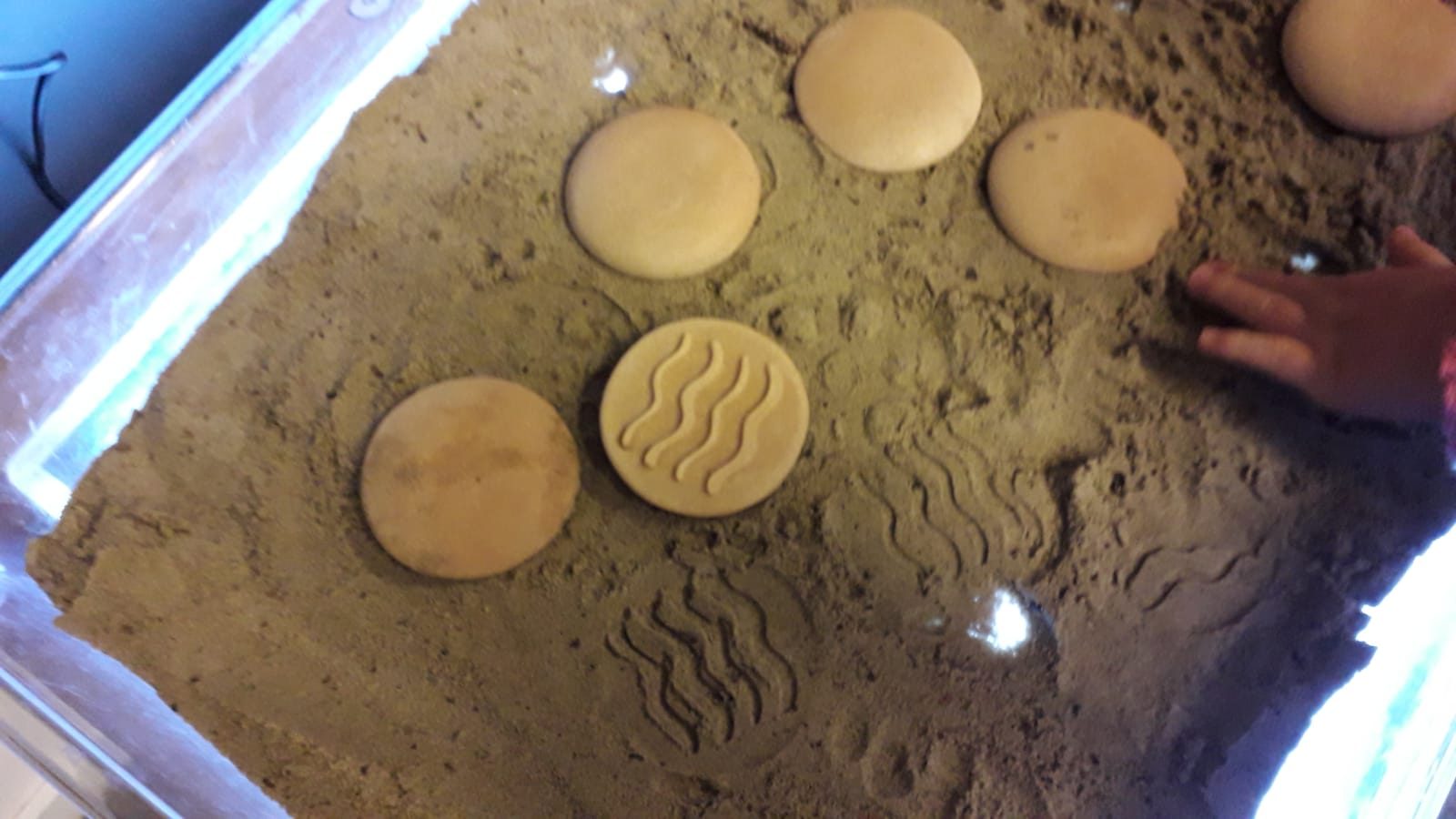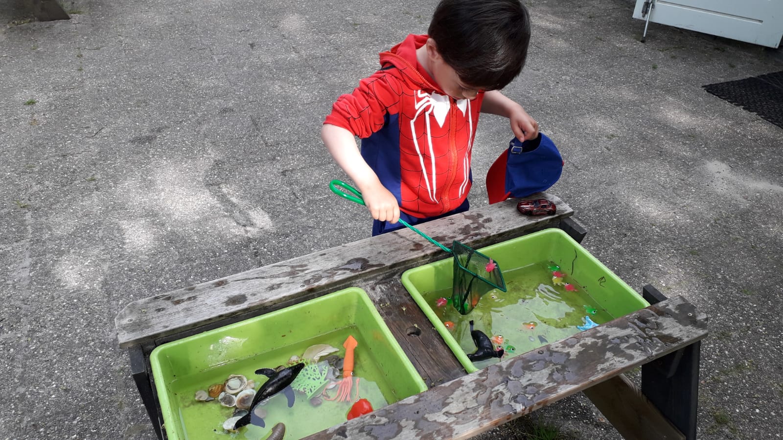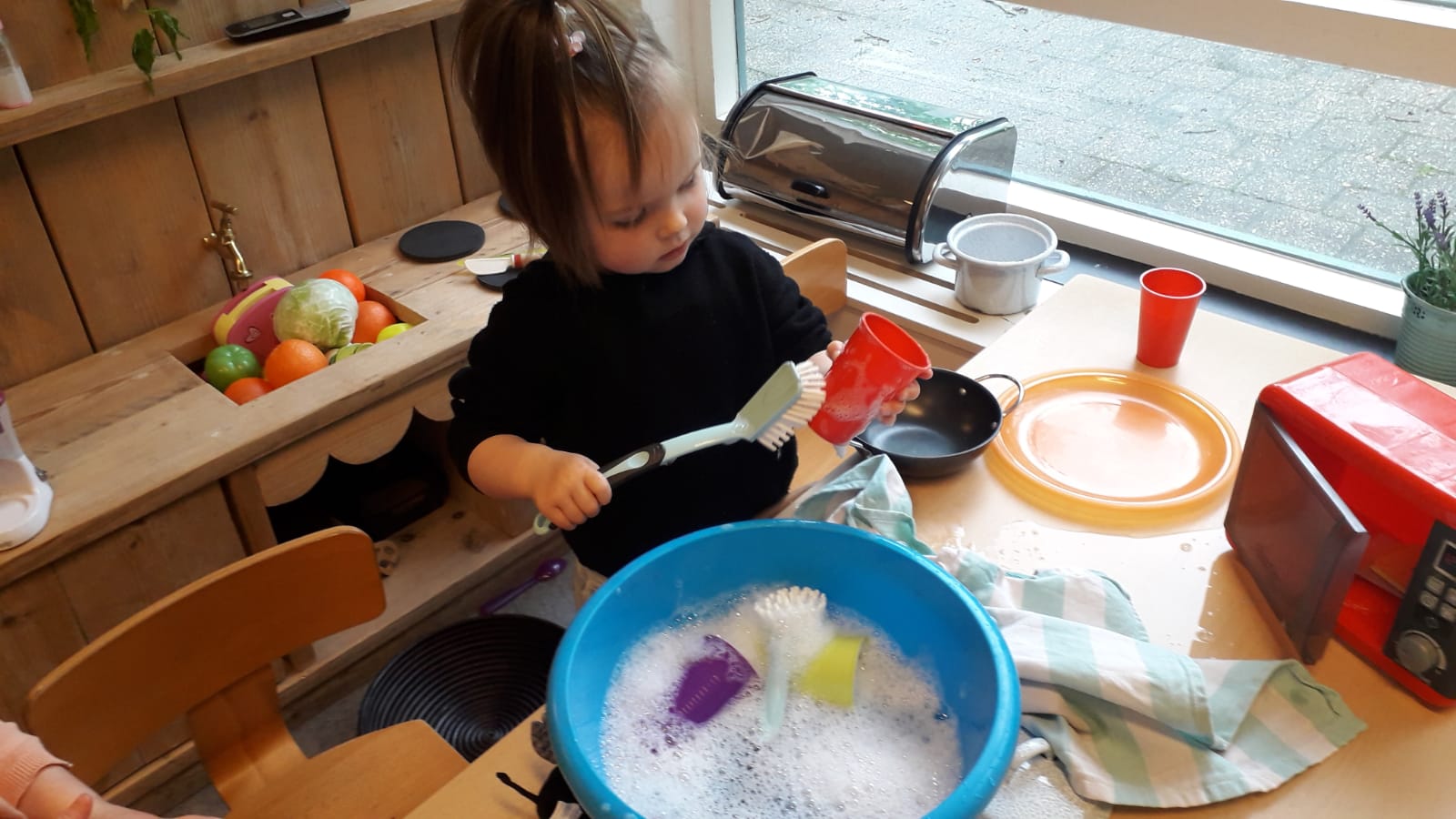 Zowel binnen als buiten wordt er met de natuurlijke materialen gespeeld. Er wordt bijvoorbeeld afgewassen in de huishoek, op de lichttafel worden afdrukken in het zand gemaakt, er worden vissen gevangen, plantjes gepoot en er wordt gespeeld met de watermuur.