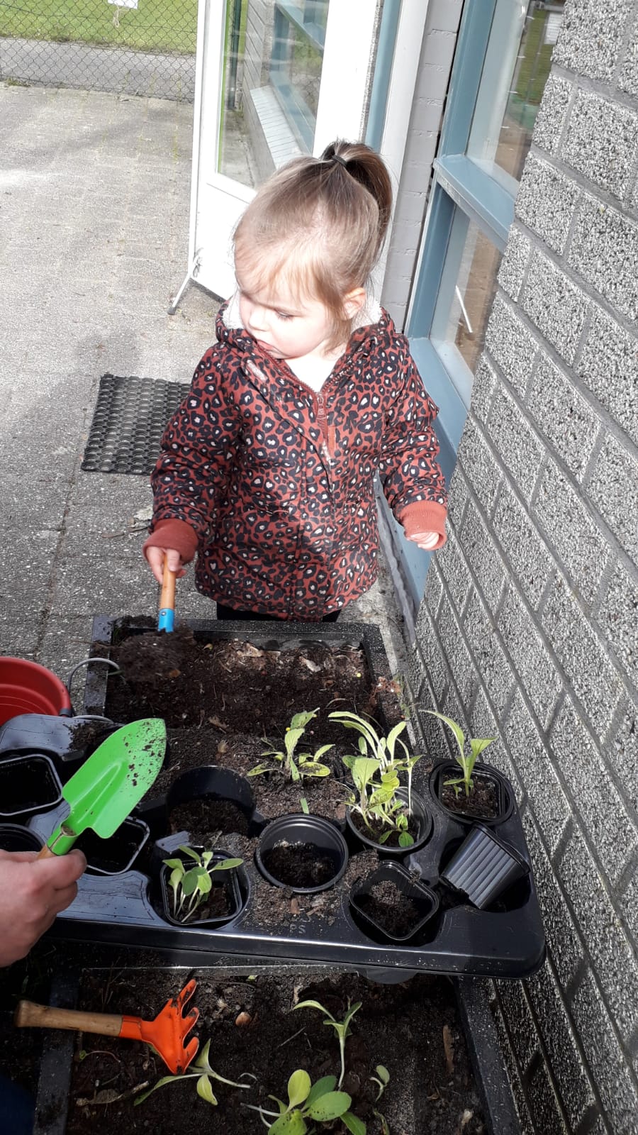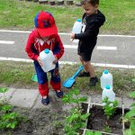Ook worden er gieters gemaakt om de planten in de moestuin water te geven. En de eerste aardbeien zijn door de kinderen ontdekt!