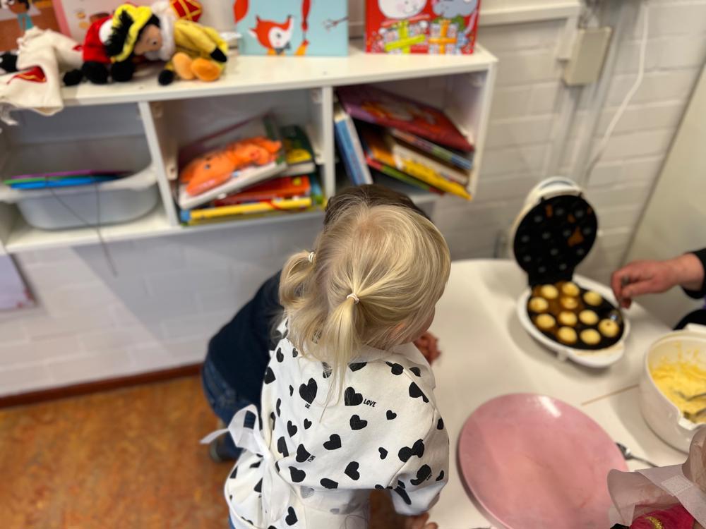 Ook hadden wij echte bakkers op de groep, want wij hebben samen lekkere popcakes gemaakt. Eerst hebben wij een schort versierd en deze hebben wij aangetrokken tijdens het bakken. Eerst moesten wij de boter romig kloppen. Vervolgens moest de cake-mix, melk en eieren in de beslagkom en kon het mixen weer beginnen. Daarna kon het beslag in de pop cake machine en was het even wachten. Daarna kon het smullen beginnen! Wat hebben alle peuters goed geholpen!