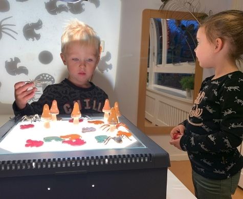 Eerst leggen ze de spullen mooi neer op de glasplaat. Maar al snel zien ze ook het schaduwspel wat op de muur ontstaat…..die verwondering is prachtig.