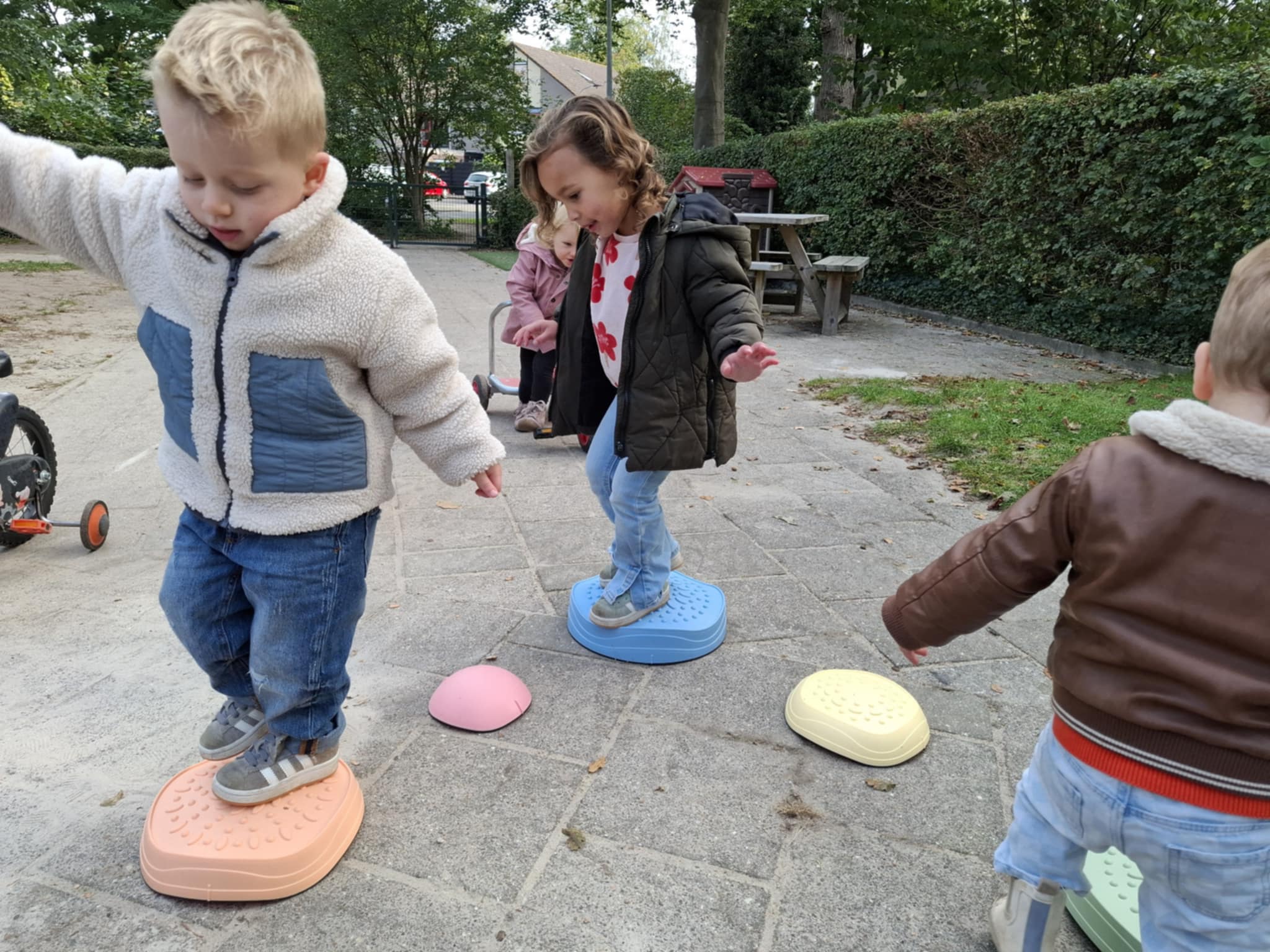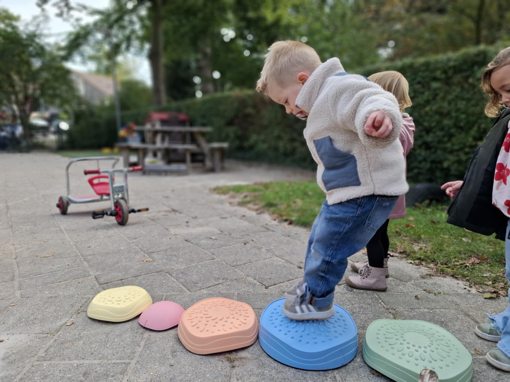Ze ontdekken dat ze een toren kunnen bouwen. Als ze de stenen op de grond neerleggen, kunnen ze er over heen lopen. We moeten dan wel goed balanceren want anders vallen we er af. Ook springen de kinderen van de ene stapelsteen naar de andere stapelsteen. De kleine kindjes voelen aan de structuur van de stenen of kijken of er iets onder de stenen ligt. Daarnaast benoemen we samen ook nog de verschillende kleuren van de stapelstenen.