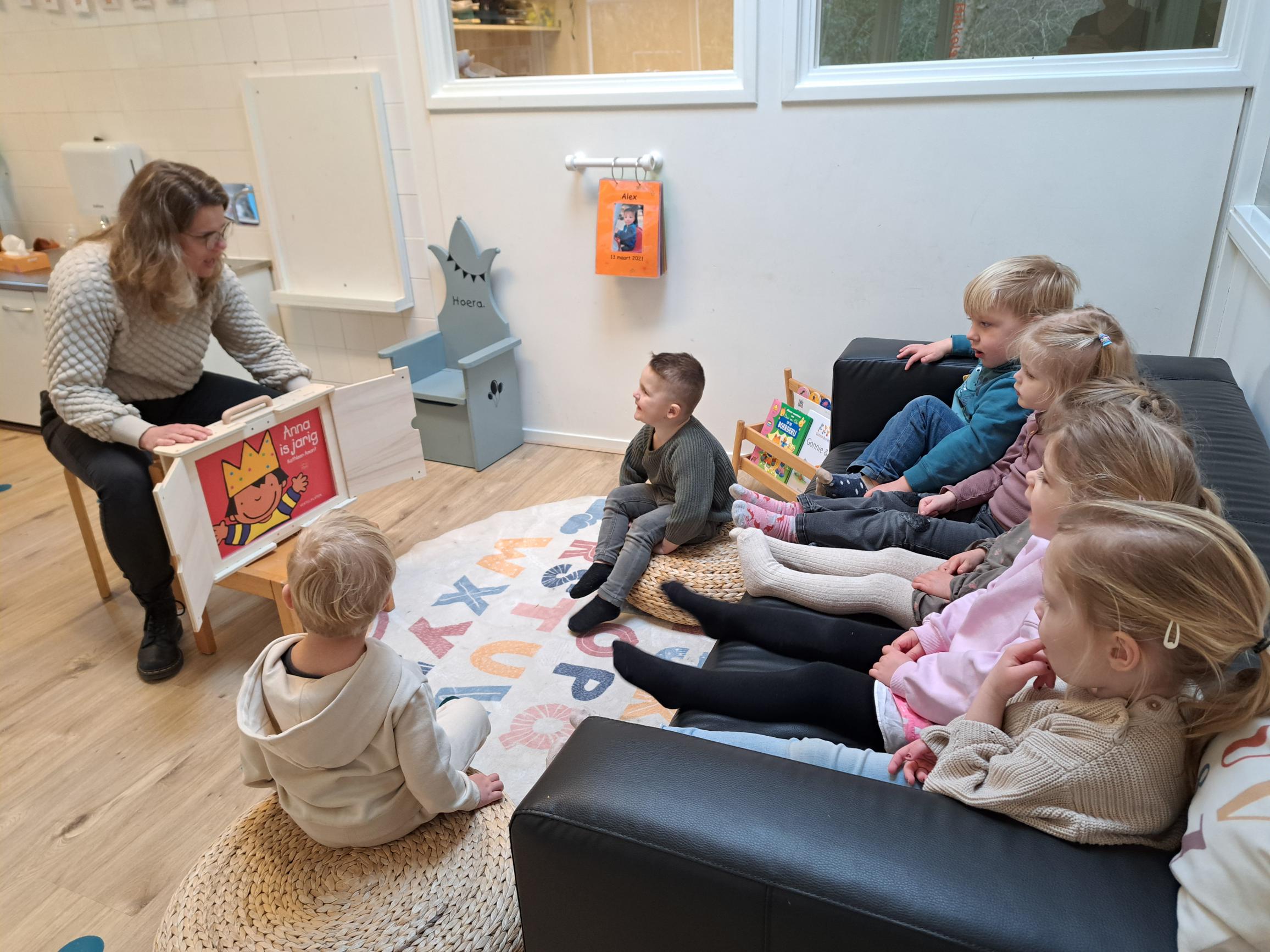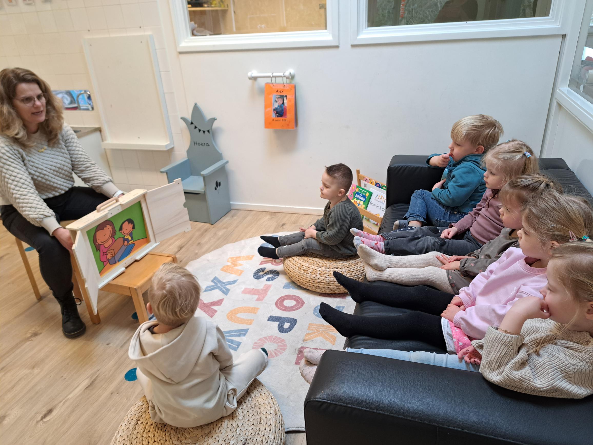 De laatste tijd maken we ook veel gebruik van de Kamishibai, een vertelkastje. Hierin zit het boek in mooie grote platen die één voor één te zien zijn. De kinderen vinden dit geweldig en dat is goed te zien: er is veel focus voor het boek en ze doen graag mee met de vragen die de pm’er stelt. Erg leuk!