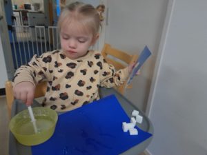De kinderen mochten deze week hun eigen iglo bouwen. Dit deden we met suikerklontjes en een beetje water met poedersuiker zodat het goed bleef plakken. Ook gooiden we deze week met de sneeuwballen een toren van sneeuwpoppen omver. Naast al deze leuke activiteiten was er uiteraard ook nog tijd om buiten te spelen. We kleden ons lekker warm aan met onze jas, sjaal, wanten en een muts. Buiten vinden de kinderen ijs, dit is toch wel koud aan onze handen hoor.