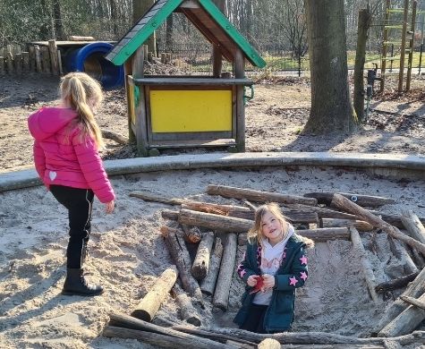Het plein van de WG v.d. Hulstschool heeft een hele grote zandbak en een leuk speelhuis, waar kinderen veel fantasiespel laten zien.