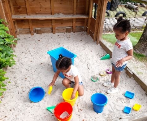 In de zandbak hebben we nieuwe zandvormen. Rond, vierkant, rechthoek of een driehoek, in de basiskleuren rood/geel/blauw/groen. Volscheppen en dan op de kop in het zand en daar komen de zandvormen tevoorschijn. Al spelend leren de peuters zo ondertussen de kleuren en de vormen.