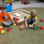 Op het gras is een bak met stenen, plankjes, auto’s en graafmachines. De auto’s kunnen over de brede rand van de bak rijden. Of van een plankje wordt een glijbaan gemaakt en daar laten de peuters de auto’s vanaf racen. Maar ook worden de stenen opgeschept en vervoerd. Er is van alles mogelijk.