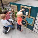 De peuters van de Buurtkabouters genieten van het heerlijke weer. Er wordt volop buiten gespeeld. Zeker met het nieuwe speelgoed. De oude politiemotor en quad zijn vervangen door glimmende nieuwe exemplaren. De speelborden zijn opgeknapt en opgehangen. Zo hebben we een voelbord met verschillende materialen eraan bevestigd, zoals schelpen, kurk, stenen, boomschijfjes, kunstgras maar ook diverse metalen sluitingen. Hier kunnen de peuters ervaren dat iets anders aanvoelt en verschillende handelingen uitvoeren met de sluitingen.