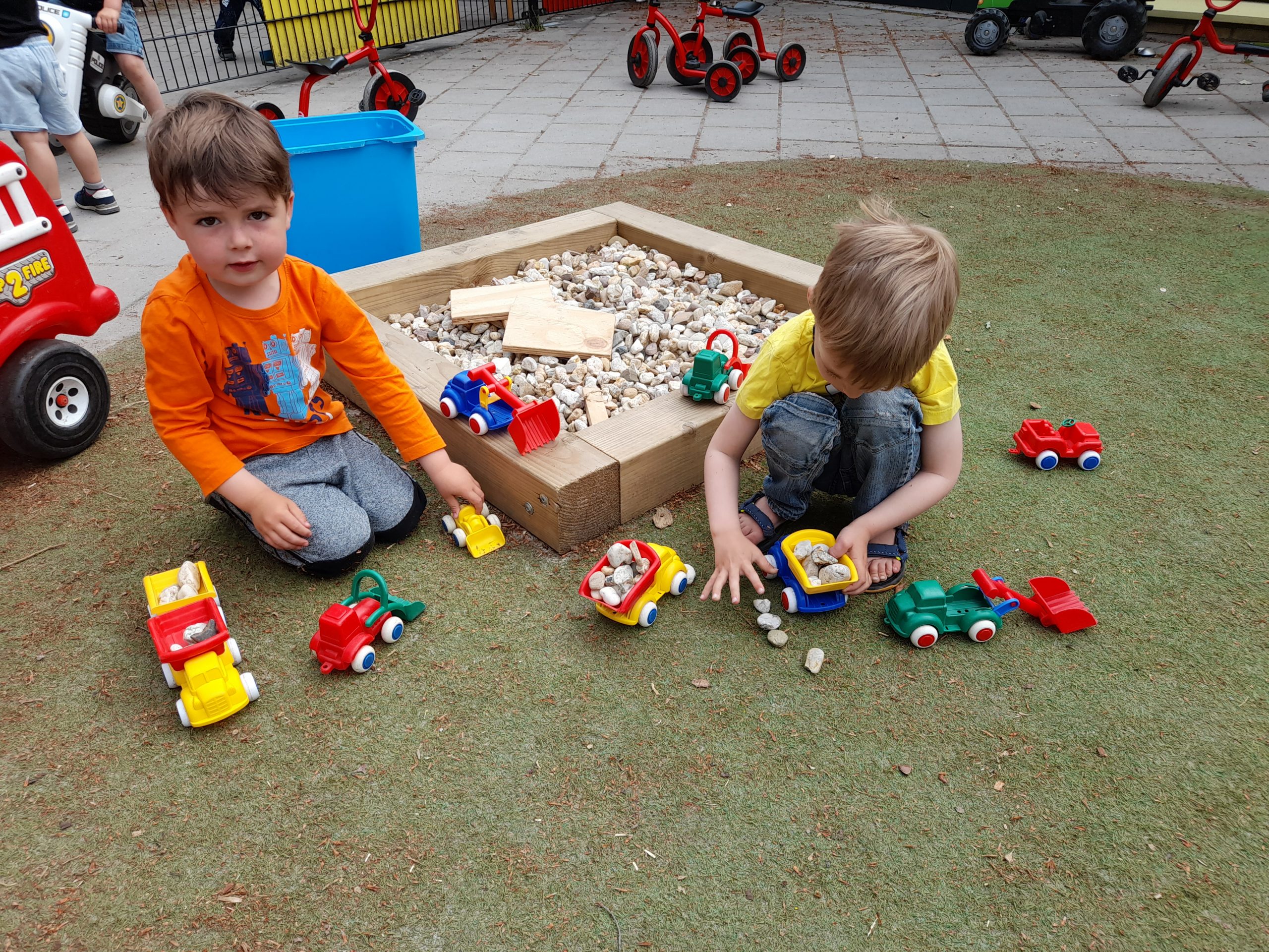 Op het gras is een bak met stenen, plankjes, auto’s en graafmachines. De auto’s kunnen over de brede rand van de bak rijden. Of van een plankje wordt een glijbaan gemaakt en daar laten de peuters de auto’s vanaf racen. Maar ook worden de stenen opgeschept en vervoerd. Er is van alles mogelijk.
