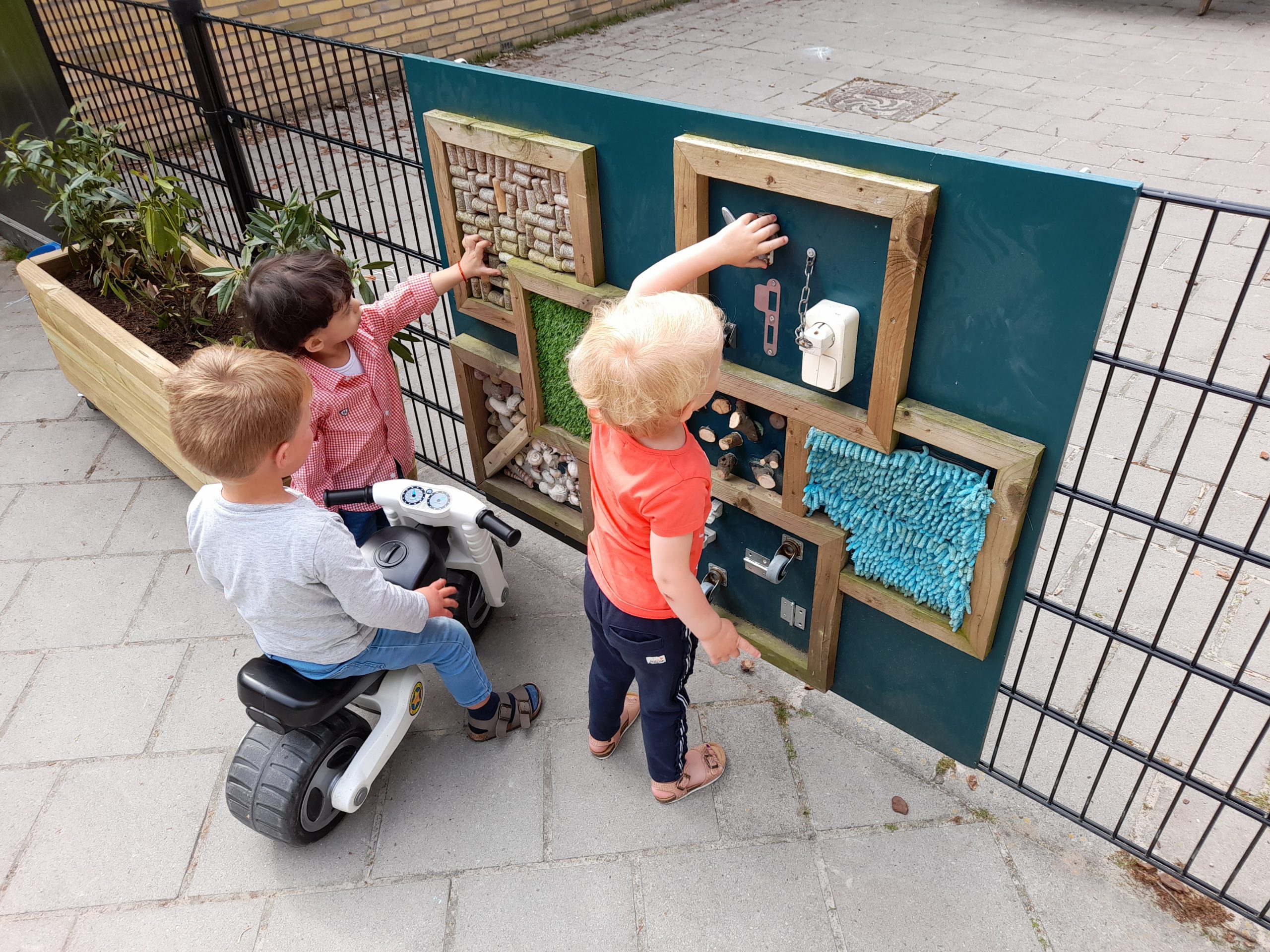 De peuters van de Buurtkabouters genieten van het heerlijke weer. Er wordt volop buiten gespeeld. Zeker met het nieuwe speelgoed. De oude politiemotor en quad zijn vervangen door glimmende nieuwe exemplaren. De speelborden zijn opgeknapt en opgehangen. Zo hebben we een voelbord met verschillende materialen eraan bevestigd, zoals schelpen, kurk, stenen, boomschijfjes, kunstgras maar ook diverse metalen sluitingen. Hier kunnen de peuters ervaren dat iets anders aanvoelt en verschillende handelingen uitvoeren met de sluitingen.