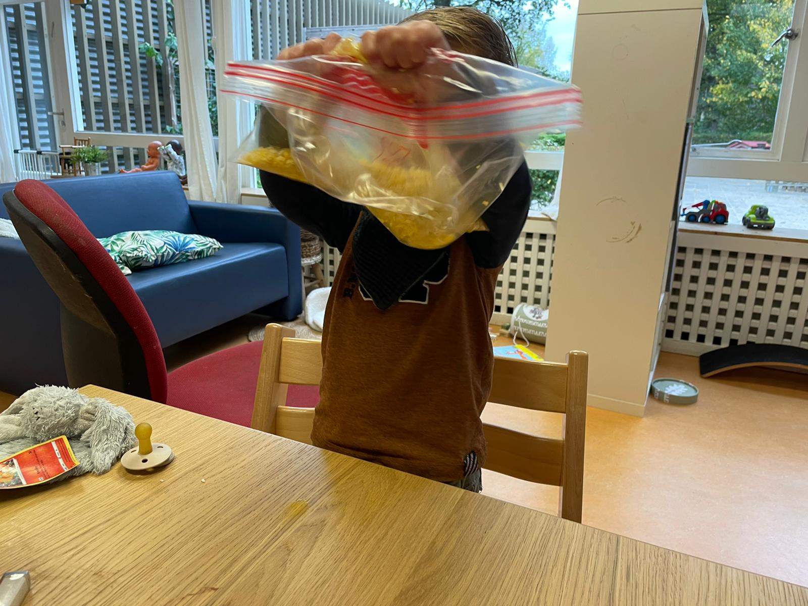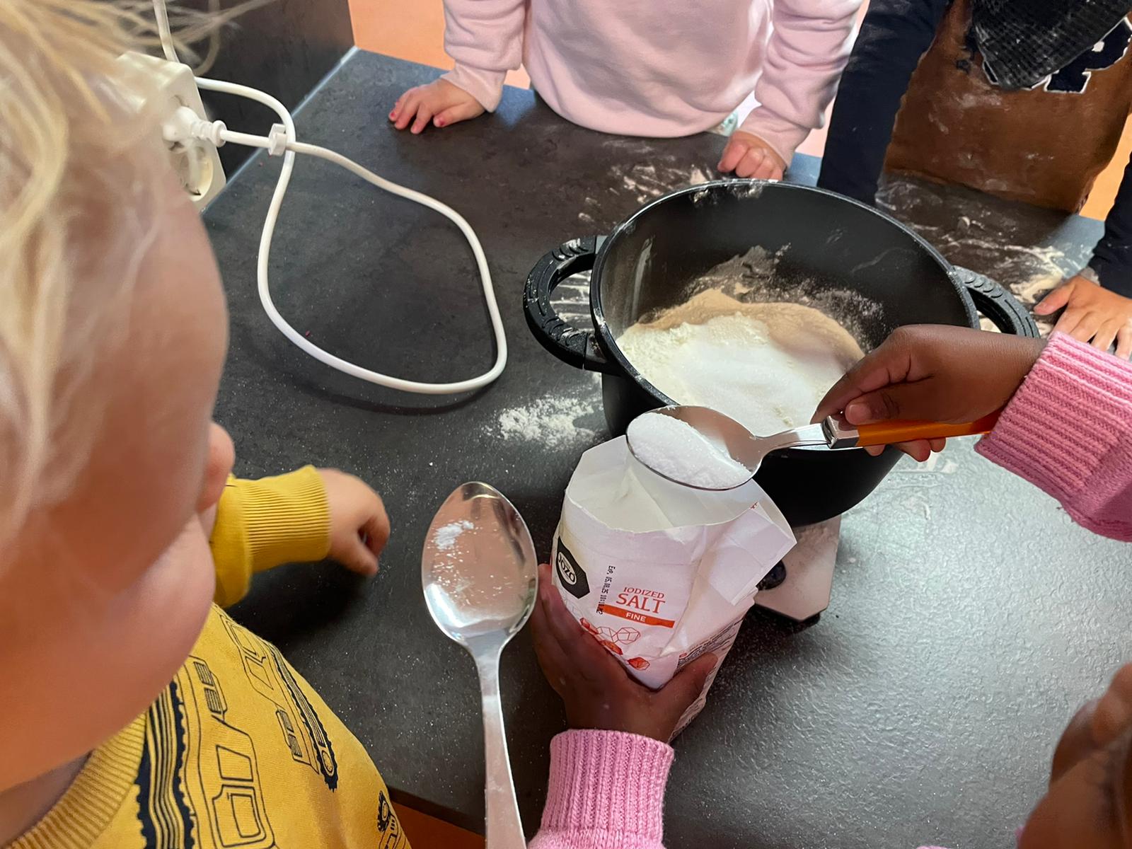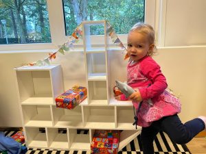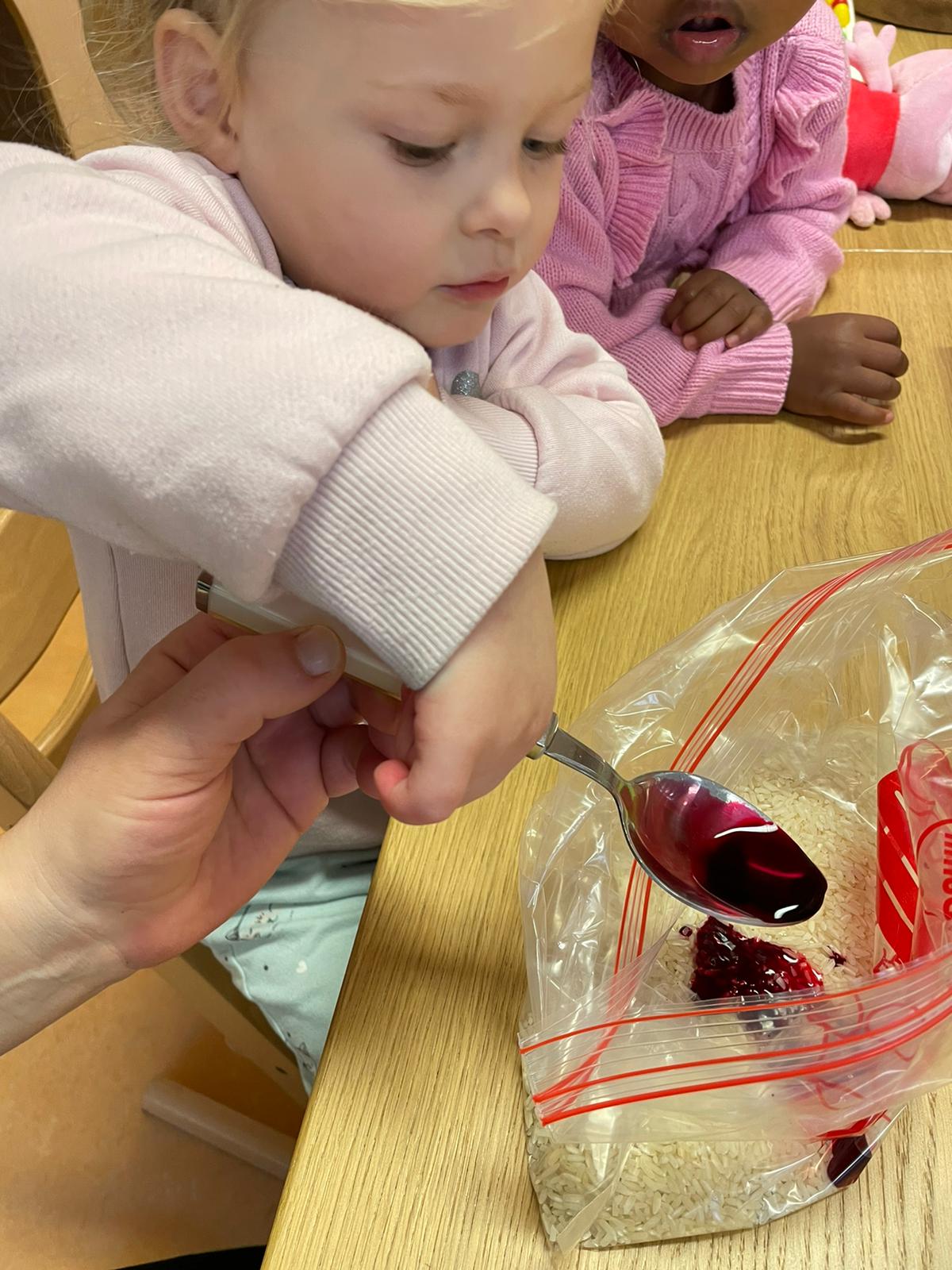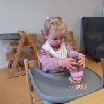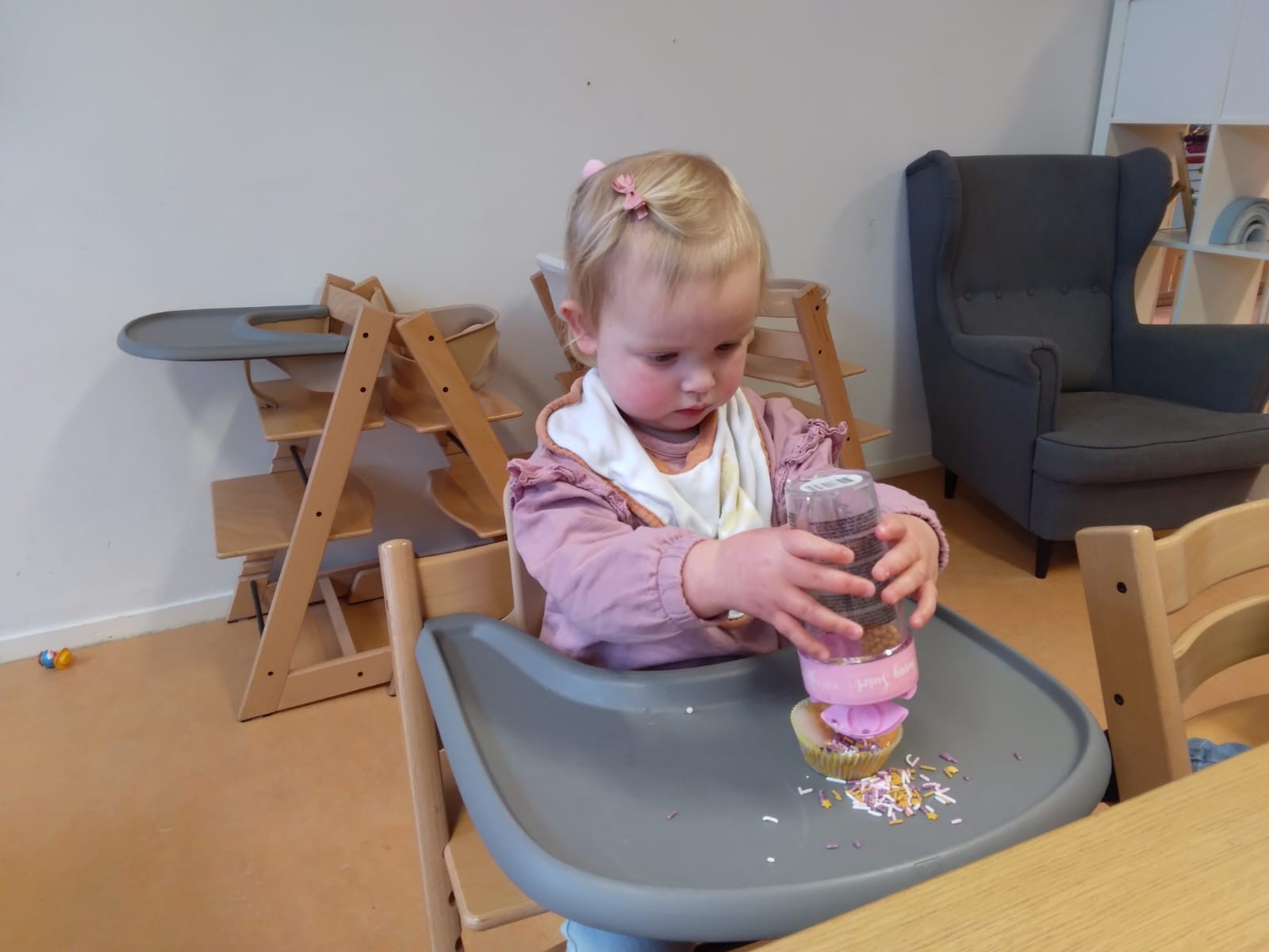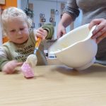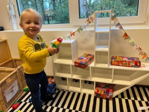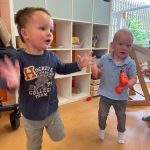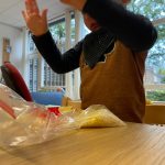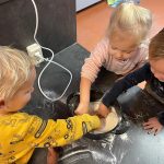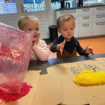 Het recente thema dat volgens de Startblokken-methode behandeld wordt, is ‘Wij vieren feest’. Nina vertelt dat de ruimtes met hulp van de kinderen versierd worden en dat er samen taartjes gebakken worden. “We vertellen wat feest is, en hebben een thematafel ingericht. In de huishoek liggen materialen die passen bij het vieren van feest. Kinderen kunnen helpen met versieren en kunnen het feestje ook echt spelen. Zo zijn er muziekinstrumenten, feestversiering en materialen om zelf taartjes en cakejes te bakken. Ook kunnen de kinderen experimenteren met ongevormde materialen. Zo staat er nu een lichtbak met gekleurde speelrijst op de groep en een zandtafel. In de zandtafel kunnen uiteindelijk ook weer materialen worden toegevoegd zodat er taartjes kunnen worden gemaakt.”