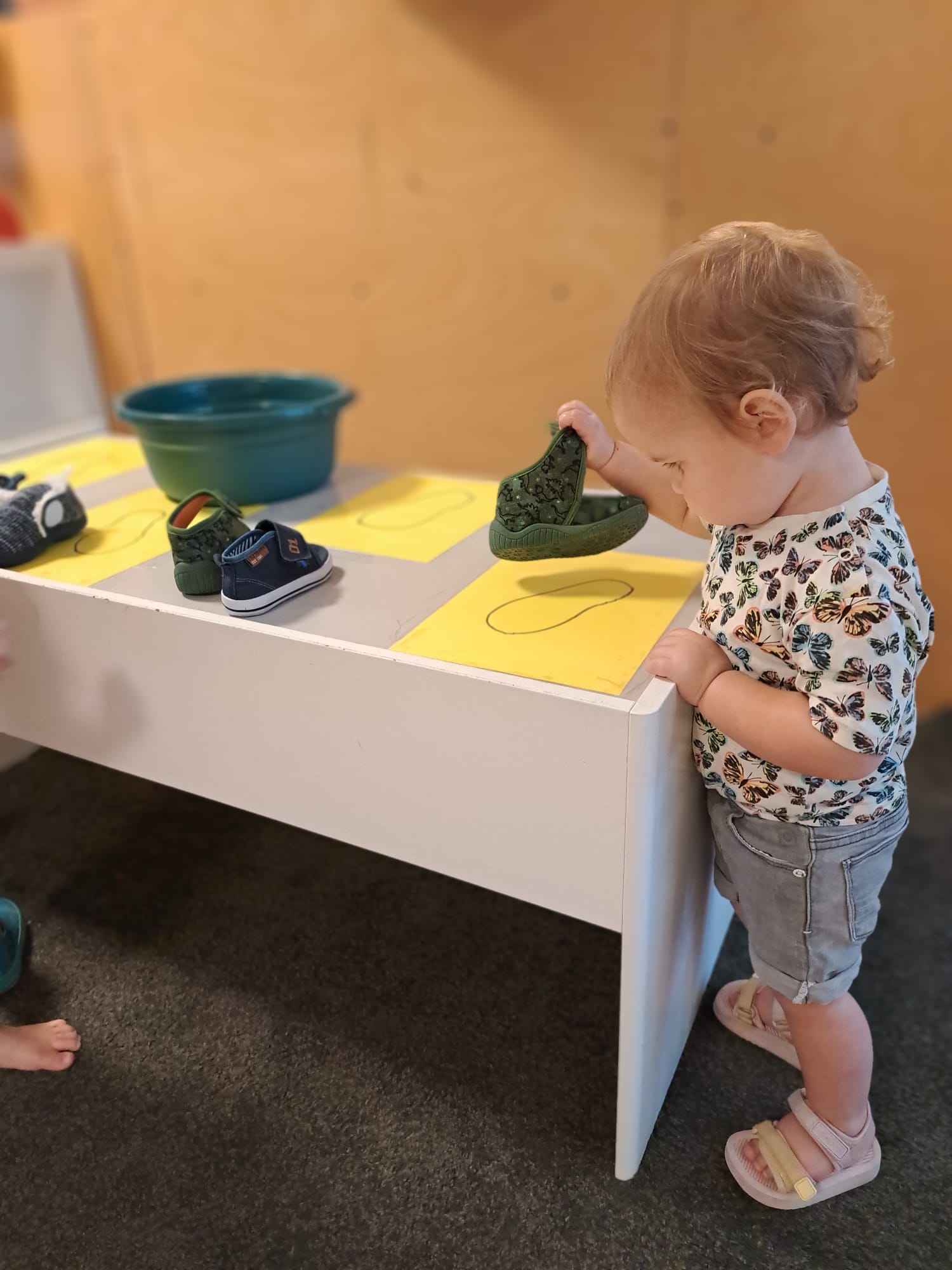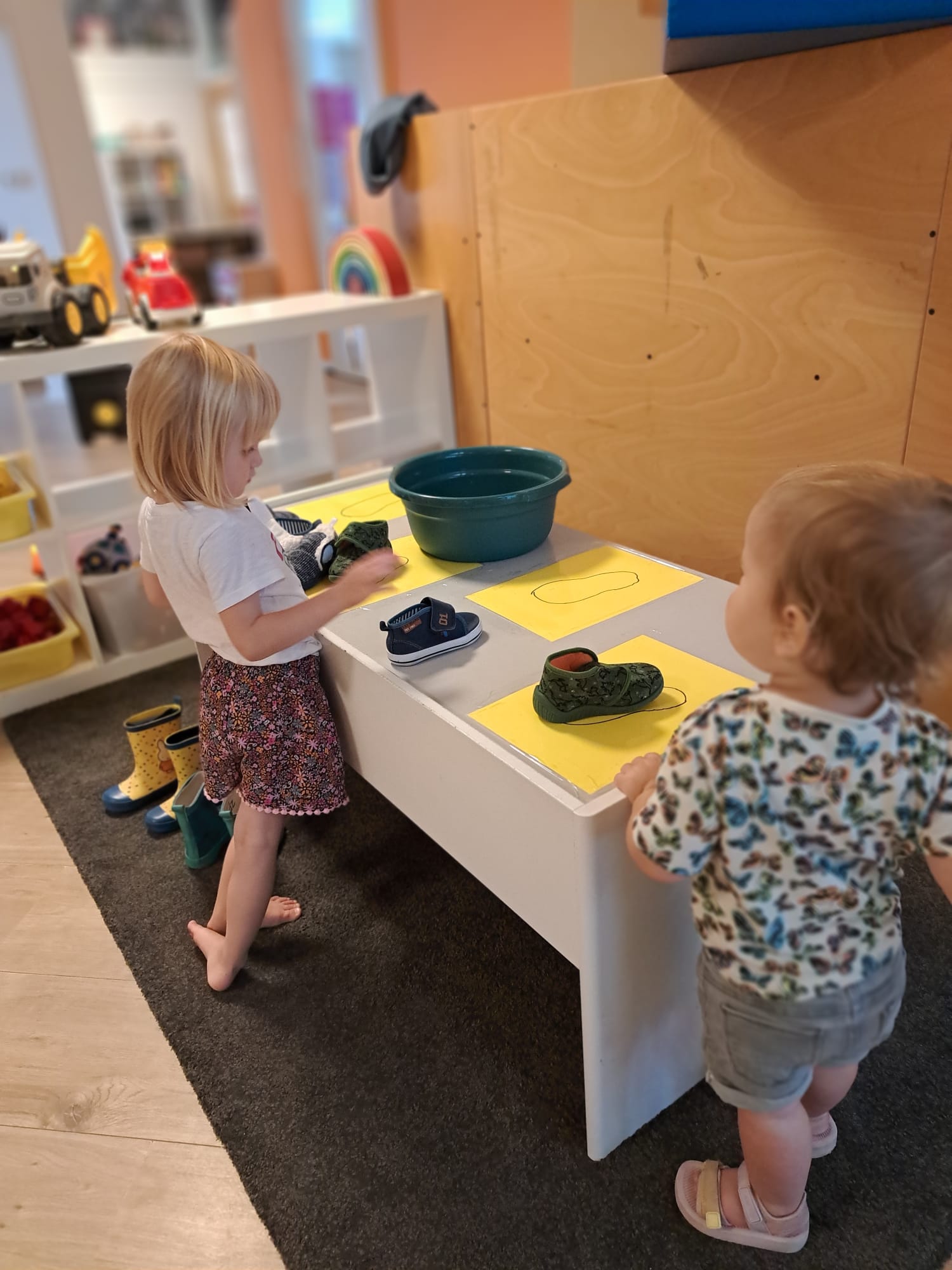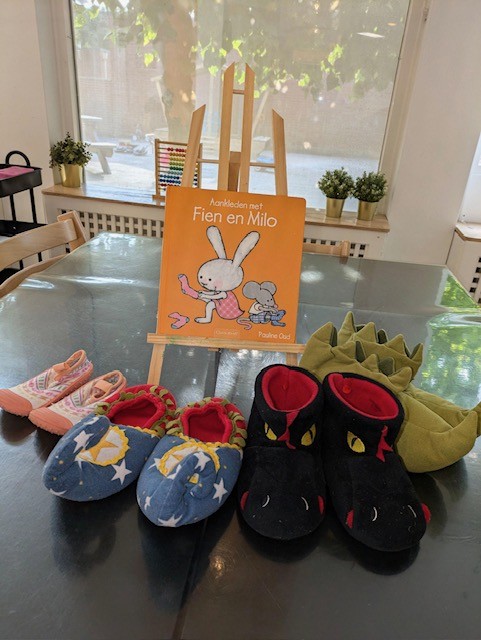Tijdens dit thema werd er voorgelezen uit het boekje aankleden met Fien en Milo. Fien probeert zichzelf aan te kleden maar weet niet waar ze moet beginnen. Milo helpt haar om in de juiste volgorde de kledingstukken aan te trekken. Na het lezen, is het tijd voor de kinderen om te oefenen. Eerst starten wij met de schoenen. De hele week wordt er gekeken naar de verschillende schoenen en proberen de kinderen deze zelf aan toen doen. Eerst kijken welke schoen aan welke voet moet en dan proberen maar. De oudere kinderen lukte het al heel goed zelf waardoor ze de jongste kinderen goed konden helpen. Ook ontdekte wij dat elke schoen een andere voetafdruk heeft. Je liep eerst door een bak met zand en bekeek daarna wat voor afdruk er in het zand was ontstaan.