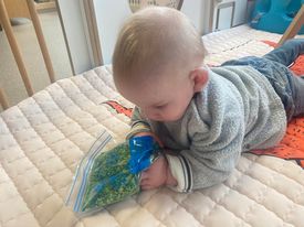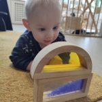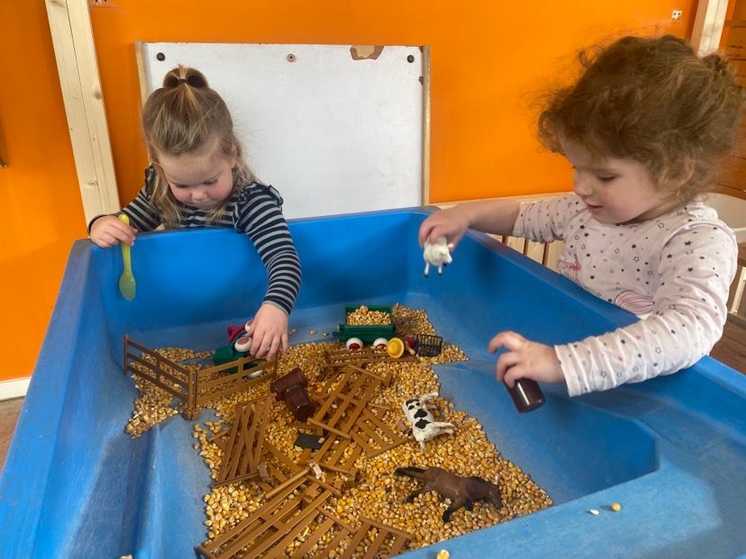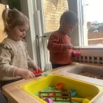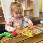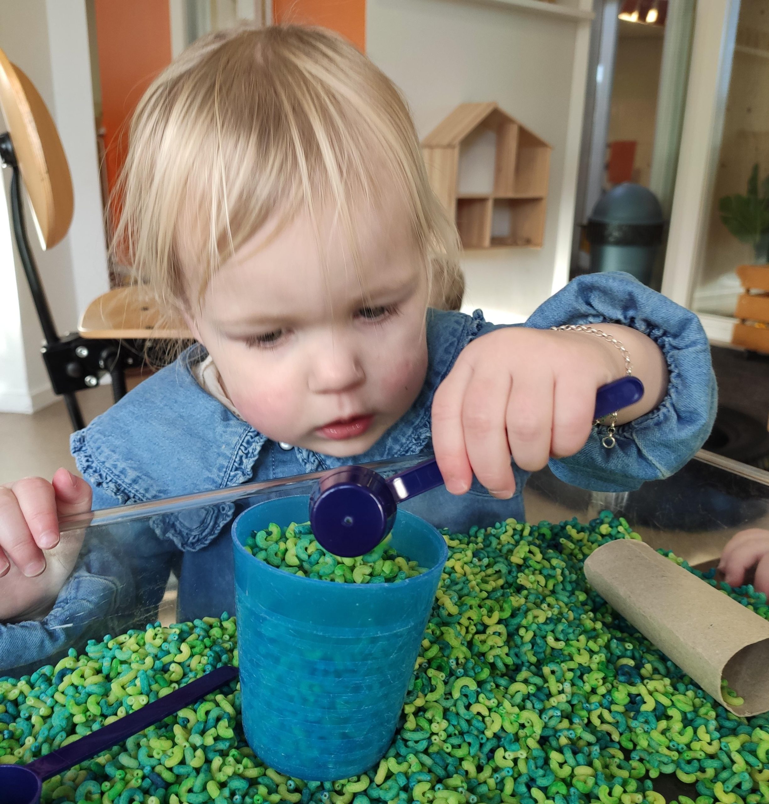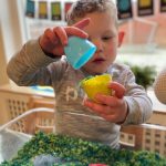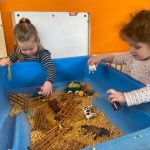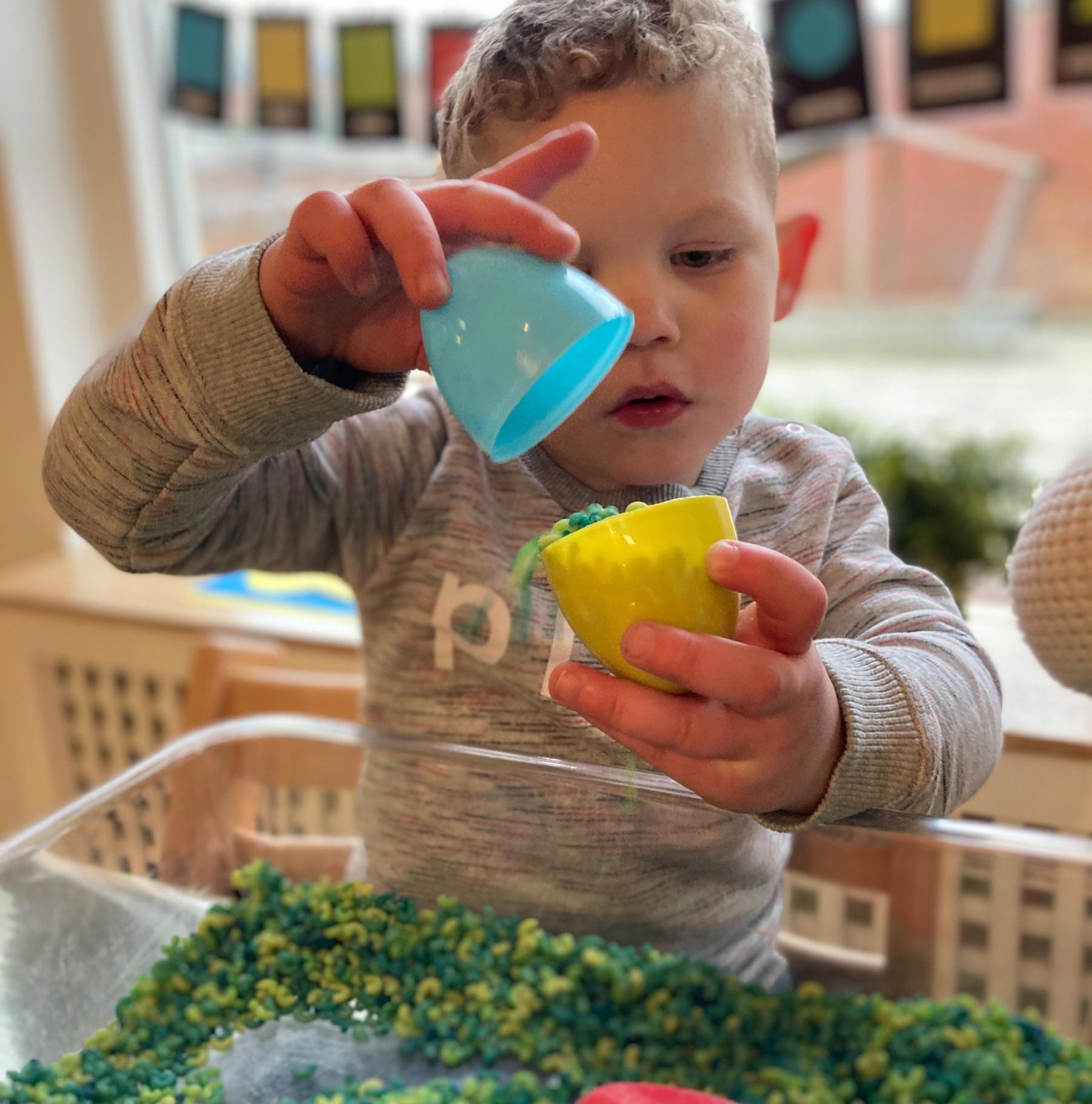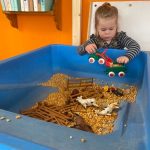 Het recente thema dat volgens de Startblokken-methode behandeld wordt, is ‘Wij vieren feest’. Nina vertelt dat de ruimtes met hulp van de kinderen versierd worden en dat er samen taartjes gebakken worden. “We vertellen wat feest is, en hebben een thematafel ingericht. In de huishoek liggen materialen die passen bij het vieren van feest. Kinderen kunnen helpen met versieren en kunnen het feestje ook echt spelen. Zo zijn er muziekinstrumenten, feestversiering en materialen om zelf taartjes en cakejes te bakken. Ook kunnen de kinderen experimenteren met ongevormde materialen. Zo staat er nu een lichtbak met gekleurde speelrijst op de groep en een zandtafel. In de zandtafel kunnen uiteindelijk ook weer materialen worden toegevoegd zodat er taartjes kunnen worden gemaakt.”