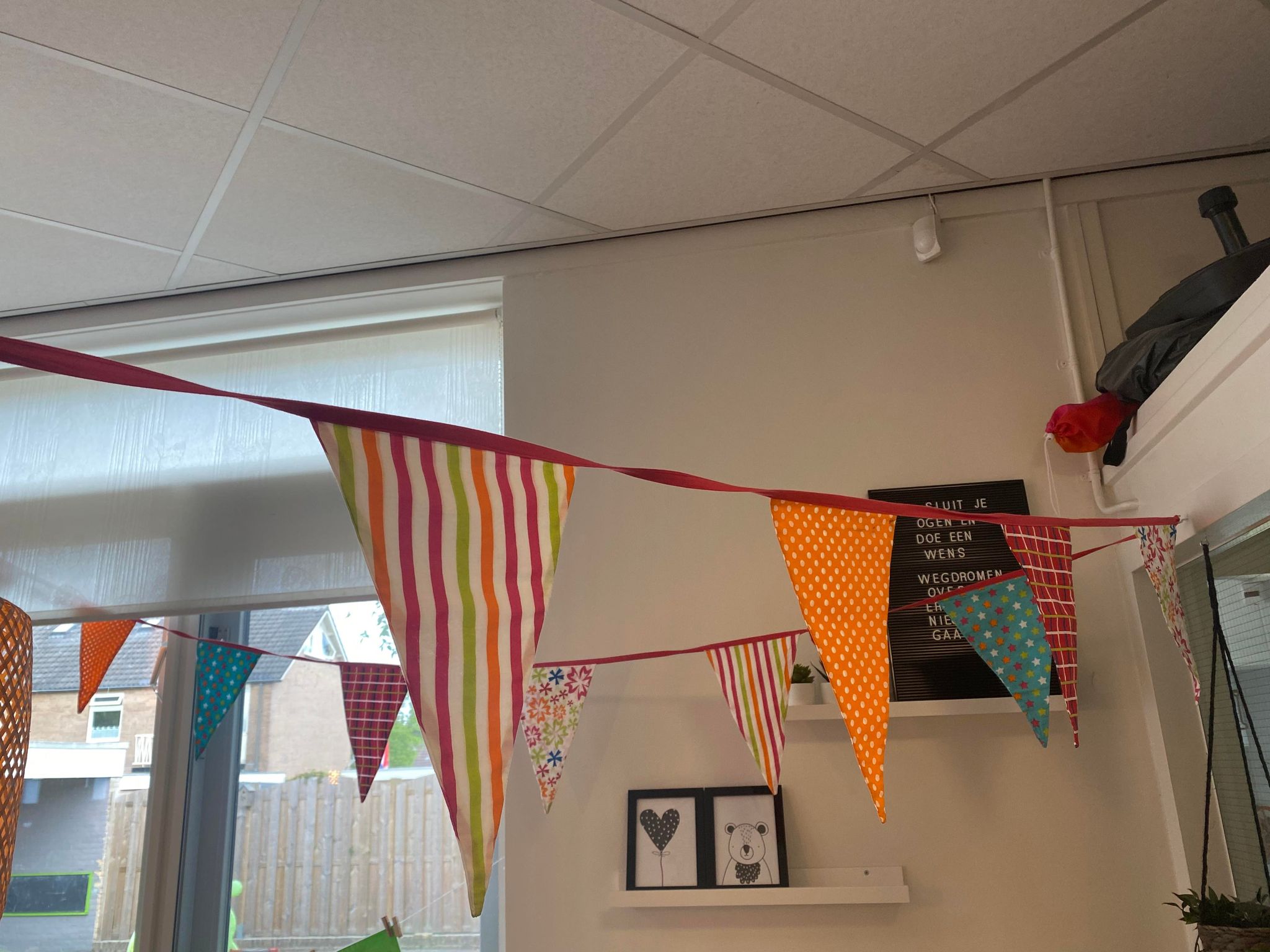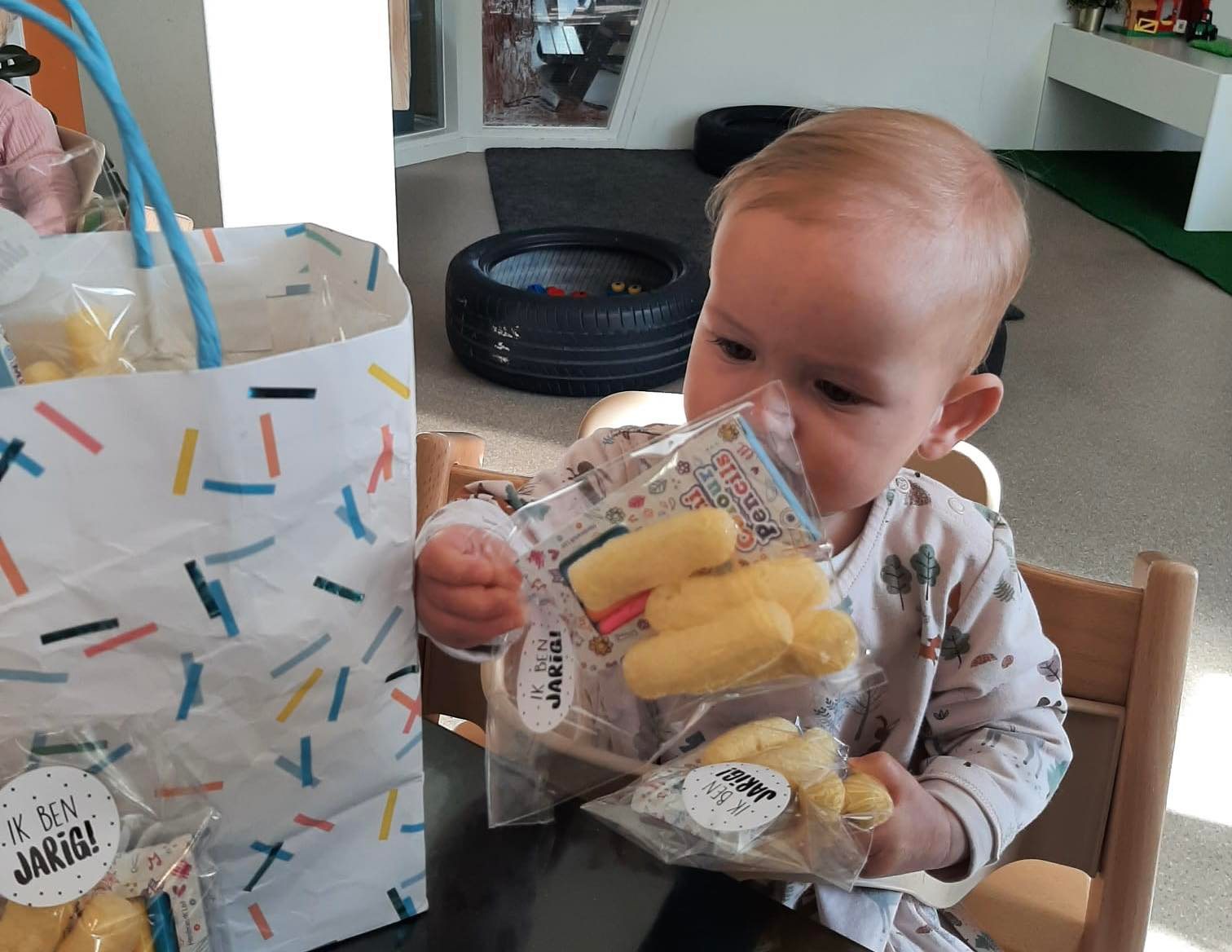 Als één van de kinderen jarig is, of korte tijd geleden jarig is geweest en bij ons die dag een feestje gaat vieren, zorgen de leidsters ervoor dat er ’s morgens slingers op de groep opgehangen worden. Zo kunnen alle kinderen op de groep zien dat we die dag een feestje gaan vieren.