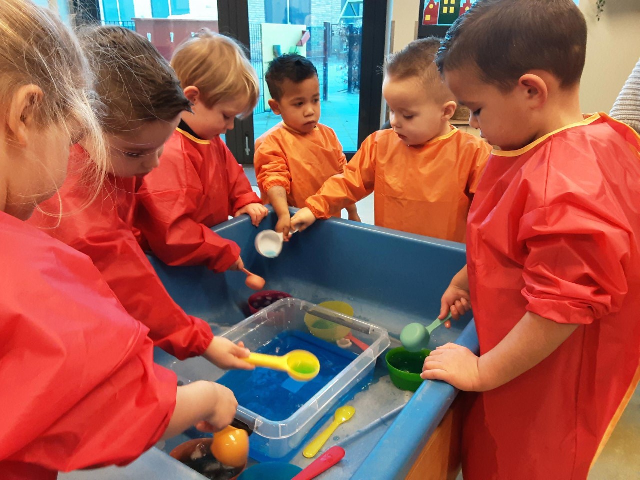 De bakken in de zandwatertafel waren ook gevuld met water en hier werd mee gespeeld met spullen uit de keuken. Roeren, scheppen in pannen en kopjes/bekertjes enz.