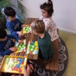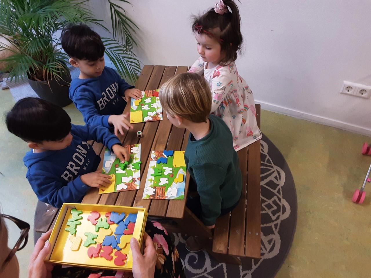 In de BSO-ruimte liggen spelletjes die ook geschikt zijn voor de peuters. Soms gaan we met een klein groepje aan de tafel één van die spelletjes doen. Zoals het kleurenspel. Ieder kind heeft een kaart waar verschillende dieren met verschillende kleuren op komen te liggen. Gooien met de kleurendobbelsteen en dan het dier met de juiste kleur erbij zoeken. Kijken of je jouw kaart vol kan krijgen. Zo oefenen we de kleuren maar ook het wachten op je beurt en elkaar helpen als de ander moeite heeft het goede dier te pakken.