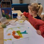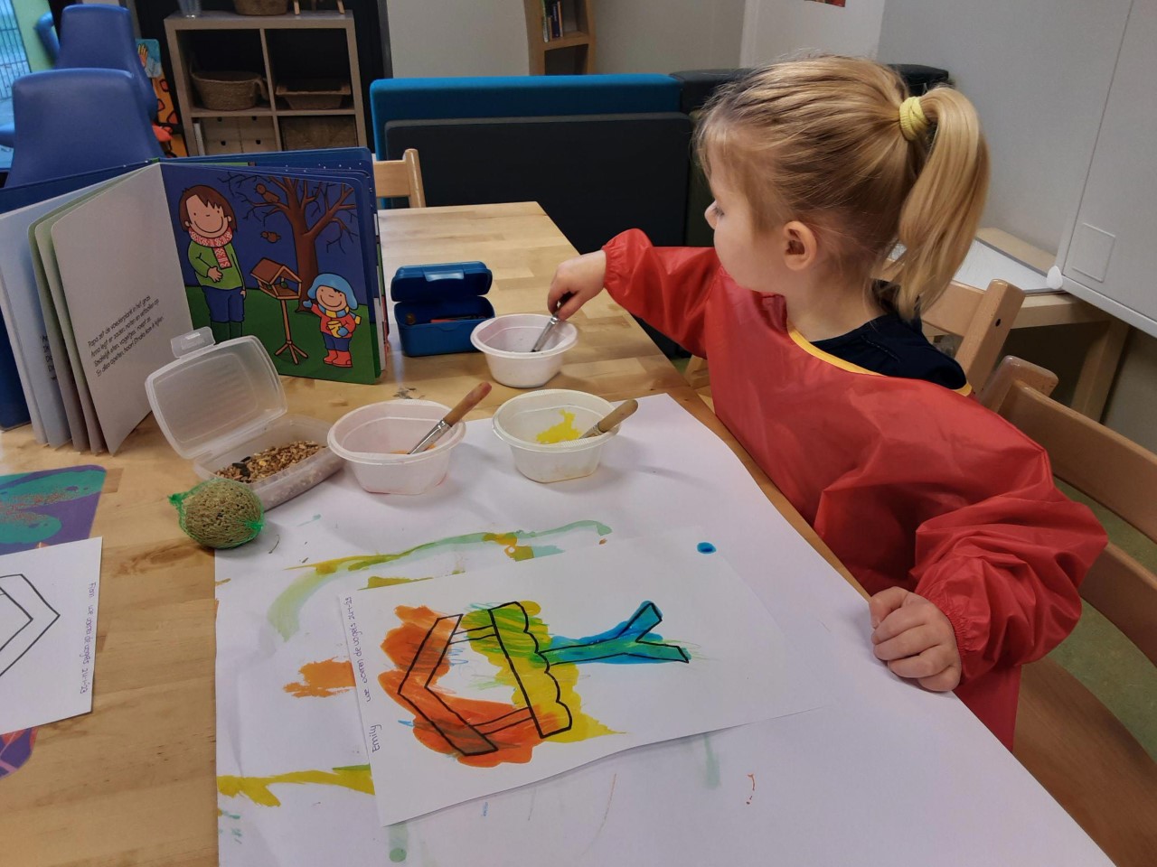 De voederbol en de zaadjes zijn nog steeds interessant. Regelmatig gaan de peuters van de Buurtkabouters dit bekijken en voelen. Wie kan er zelf een grote bol of kleine zaadjes tekenen. Met wasco mogen de peuters dit proberen in een vogelhuisje te tekenen. Daarna mogen ze met de kwast met ecoline eroverheen. Het lijkt wel toveren want nog steeds zien ze de wascotekening.