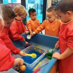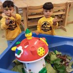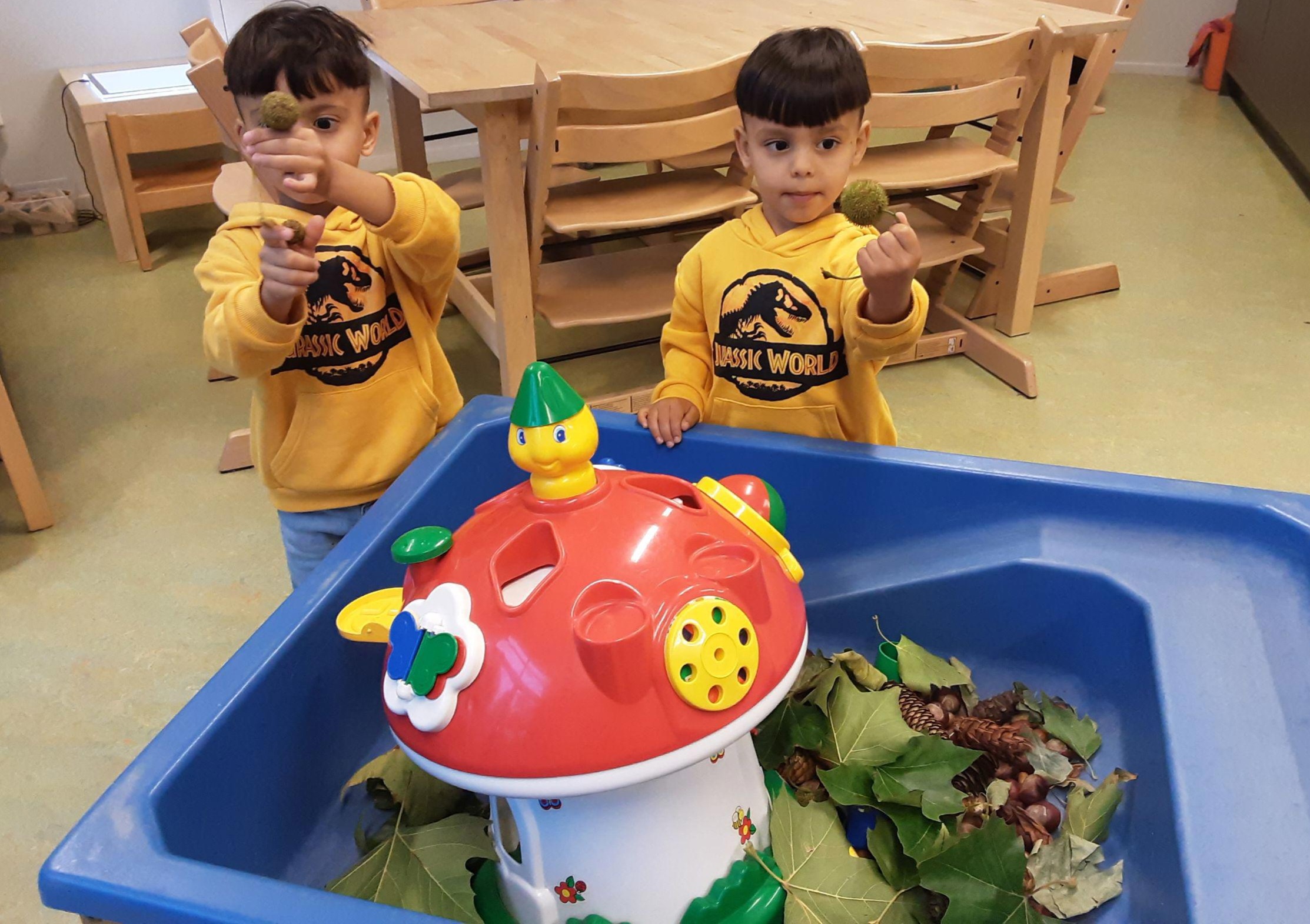 De zandwatertafel ligt nu vol met allerlei herfstmaterialen. Hierin liggen noten, bladeren en takjes. Alles door de peuters zelf gezocht. Er liggen insecten, kabouterfiguurtjes en een interactieve speelpaddenstoel staat ertussen. De peuters laten de noten rollen van de schuine kant, stapelen, maken rijtjes, doen ze door de openingen in de paddenstoel etc. De insecten lopen of kruipen over de rand of in de paddenstoel. De bladeren worden vastgehouden, mee gezwaaid, in stukjes gescheurd. Er is zoveel te ontdekken en te spelen.