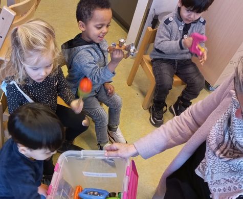 Bij de Buurtkabouters is met alle peuters juffendag gevierd. De juffen vieren dan hun verjaardagen tegelijk en als voorbereiding daarop hebben we de laatste 2 weken in de kring muziek gemaakt. De peuters mochten zelf een instrument uitzoeken en gebruiken. We luisteren naar elkaars instrument, want er zijn verschillende die een ander geluid maken. We proberen hard en zacht muziek te maken, langzaam en snel en natuurlijk zingen we gezellig liedjes erbij. Wat is dit leuk om te doen.