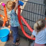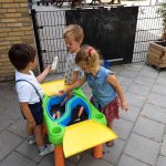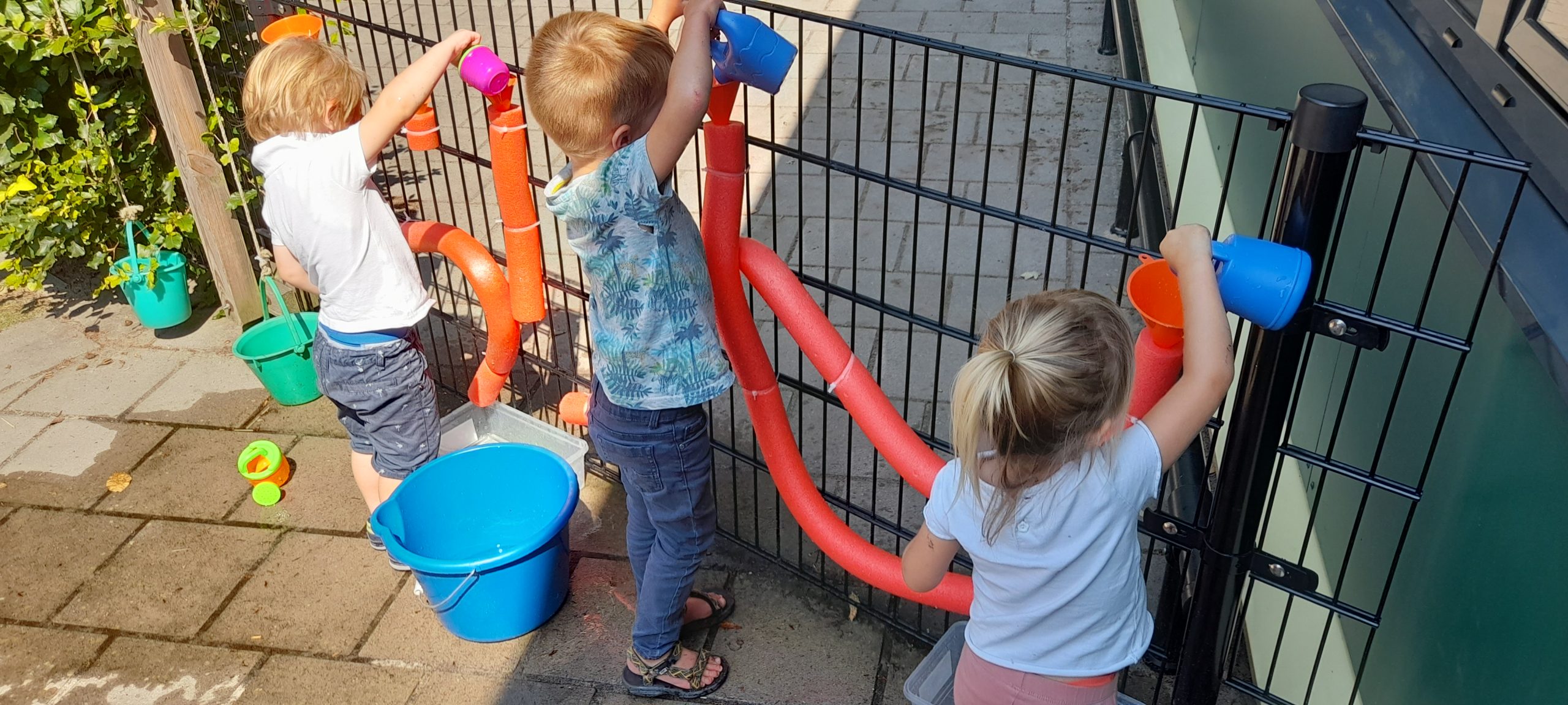 Onze nieuwe waterbaan is echt een succes. Water met gietertjes in de trechters gooien en dan gaat het door de flexibele buizen er aan de onderkant weer uit. Wat een plezier en hebben ze gehad en vies worden mag natuurlijk!
